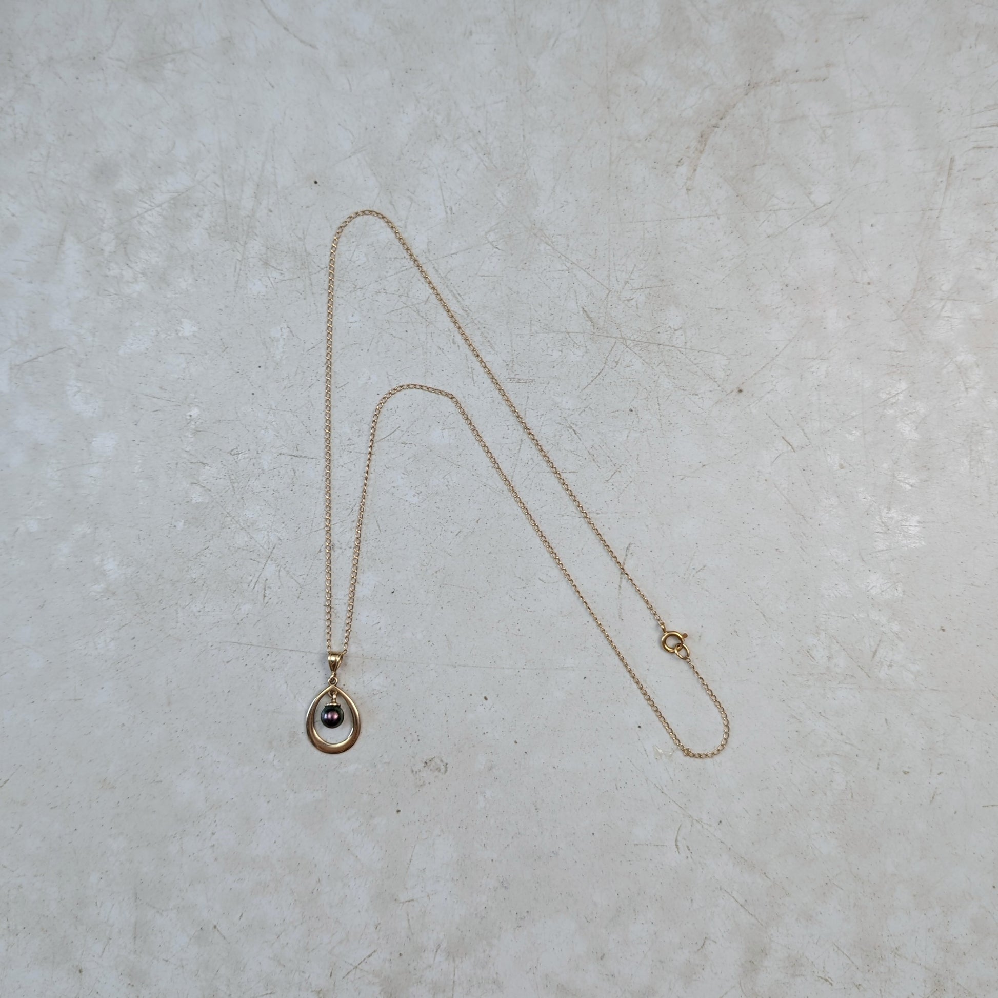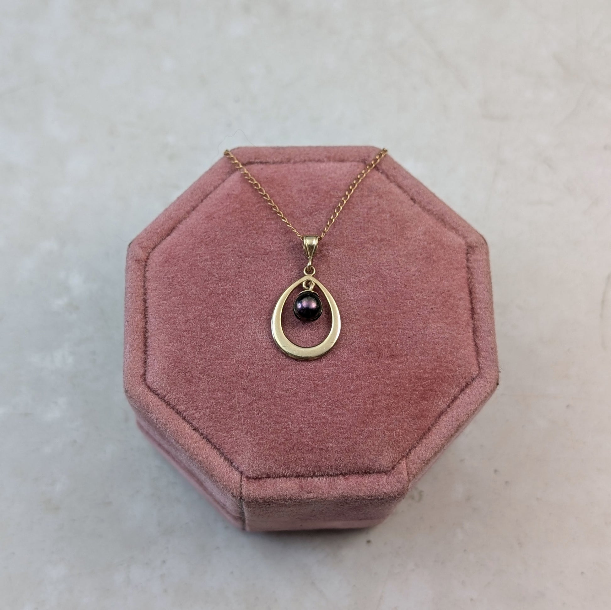 - pendant features a 4.5mm round black pearl suspended inside a tear drop pendant