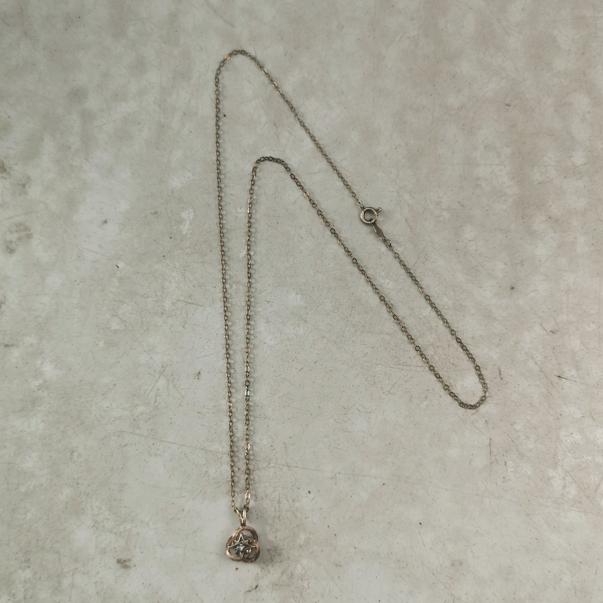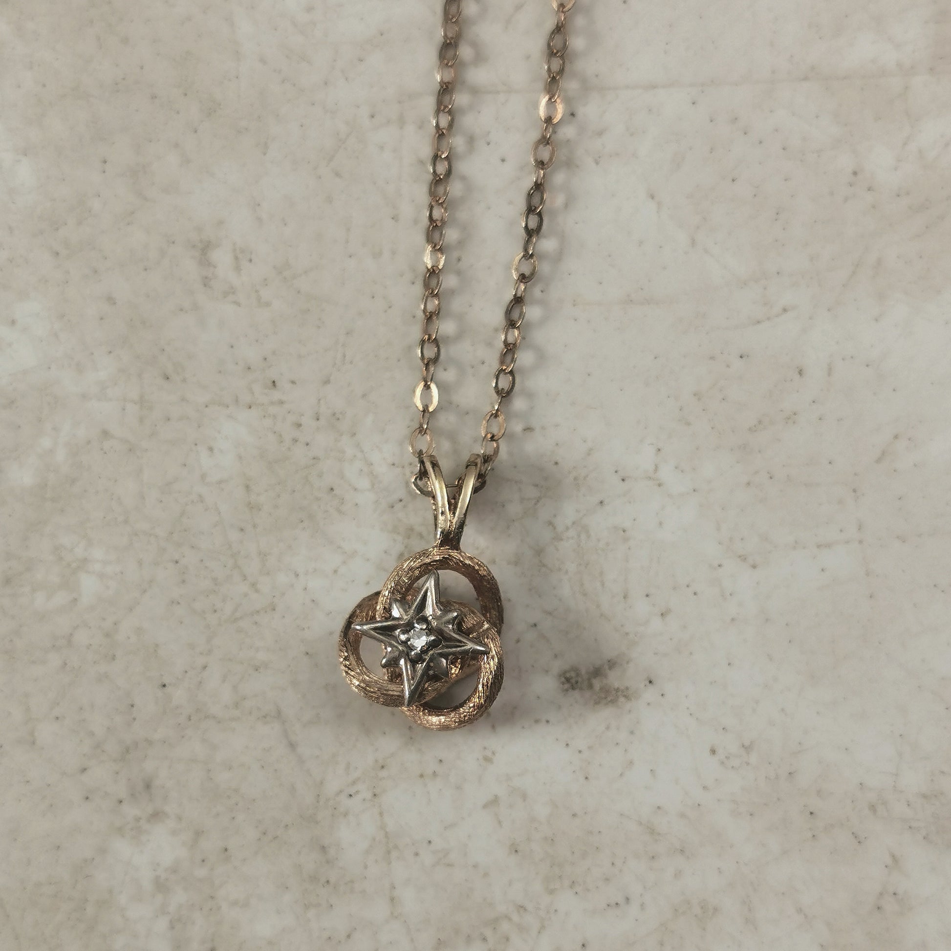 Vintage necklace constructed out of solid sterling silver with gold vermeil, white gold, and diamond. This sweet necklace features a sterling silver love knot pendant set with a white gold star on top, with a 0.01ct single cut diamond. Pendant is strung on original 18" fine cable chain. The gold vermeil has worn off spring ring to show sterling silver underneath.