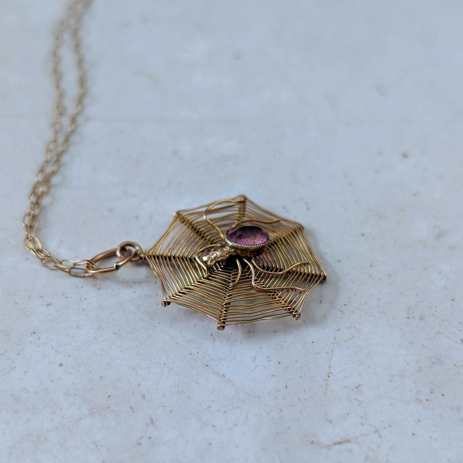 Victorian 9ct Yellow Gold Spider Web Charm Necklace