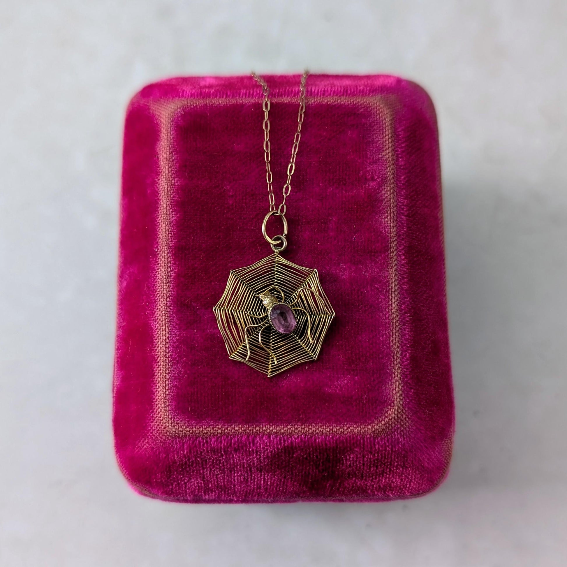 - this beautifully detailed pendant features a tiny spider sitting atop a delicately woven web from extra fine gold wire
