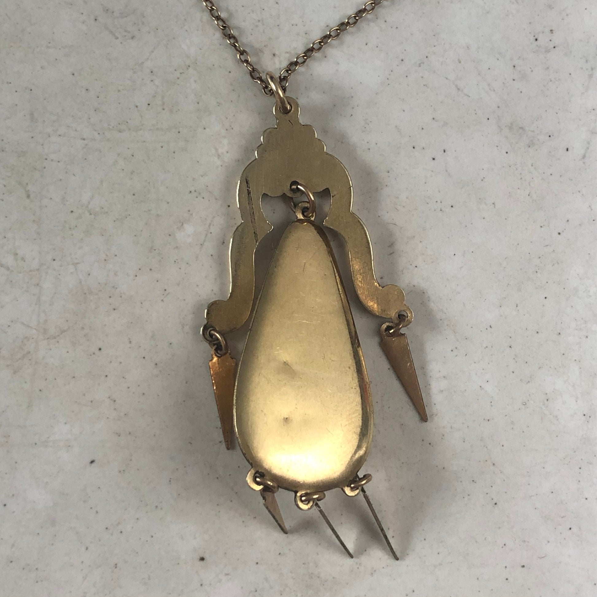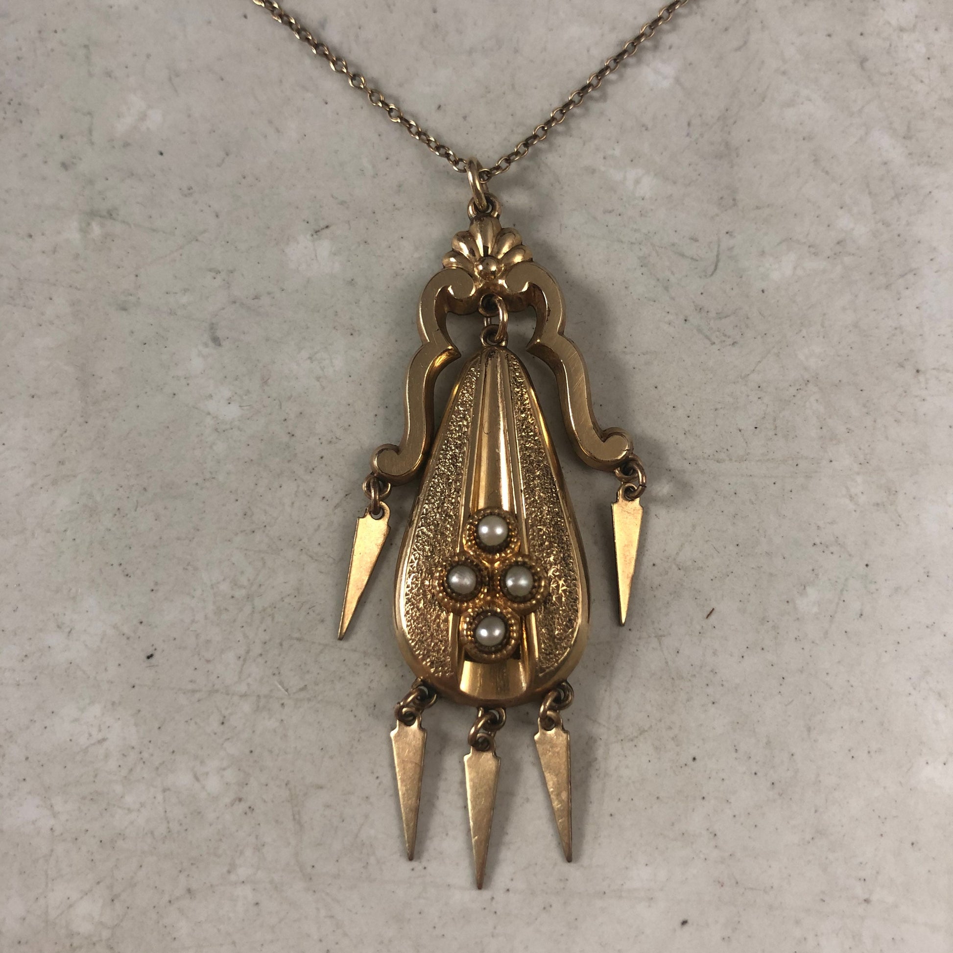 The necklace has an ornate torpedo style dangling pendant set with 4 natural genuine split pearls. Because of the hollow form, the pendant has a few dents on back and one scratch. Pendant measures 5.5cm long x 2cm wide with an 18" gold filled cable chain with properly working spring ring closure.