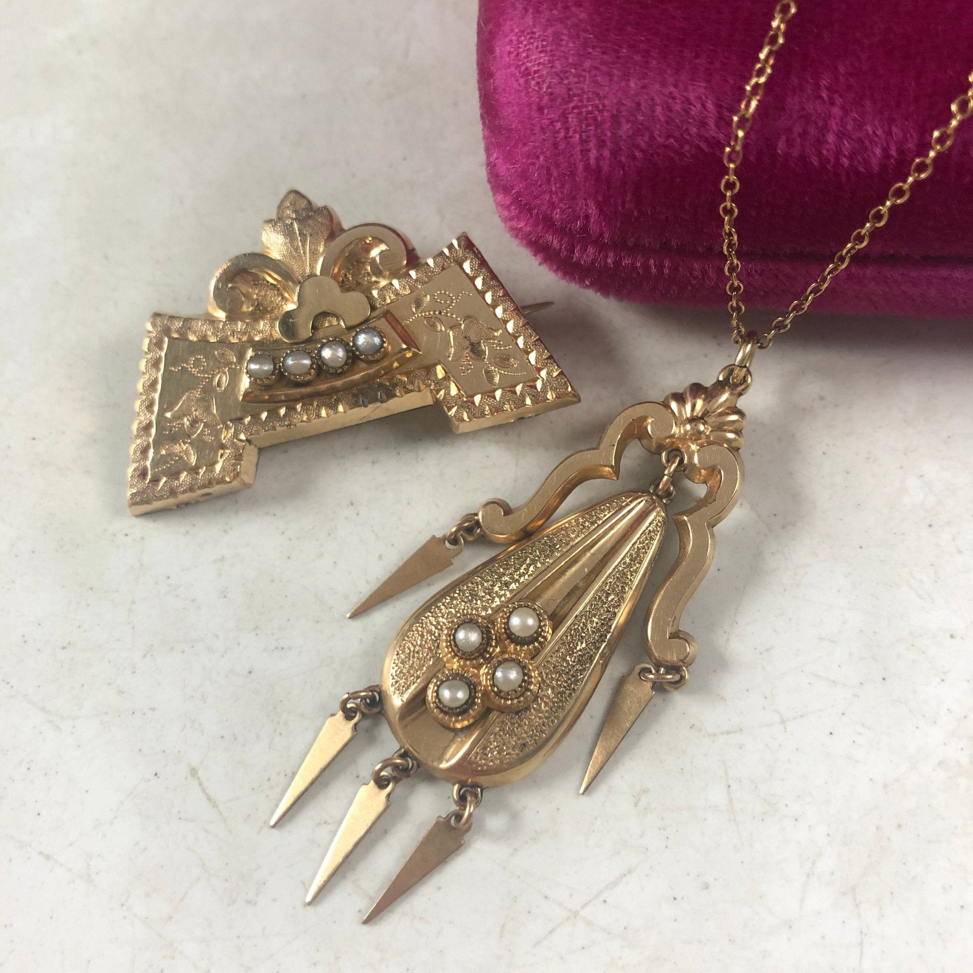Victorian Gold Filled Seed Pearl Necklace and Brooch Set