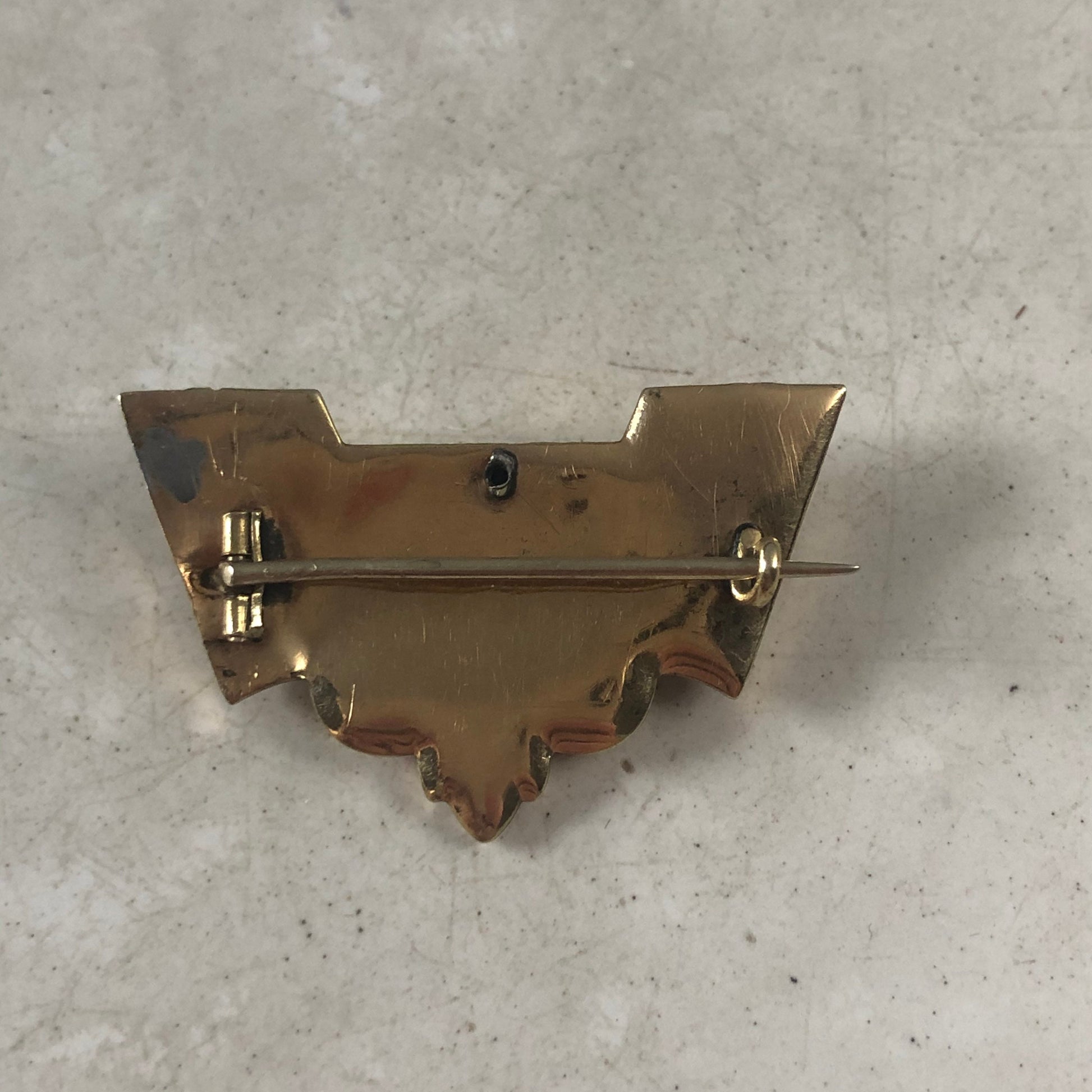 Brooch has beautiful engraved designs as well as flowers and leaves with 4 natural genuine split pearls on the face. There is also some minor denting and some lead solder visible on the back with minor splitting along the seams. Original c-hook and pin in working order. Brooch measures 3.5cm long x 1.8cm tall.