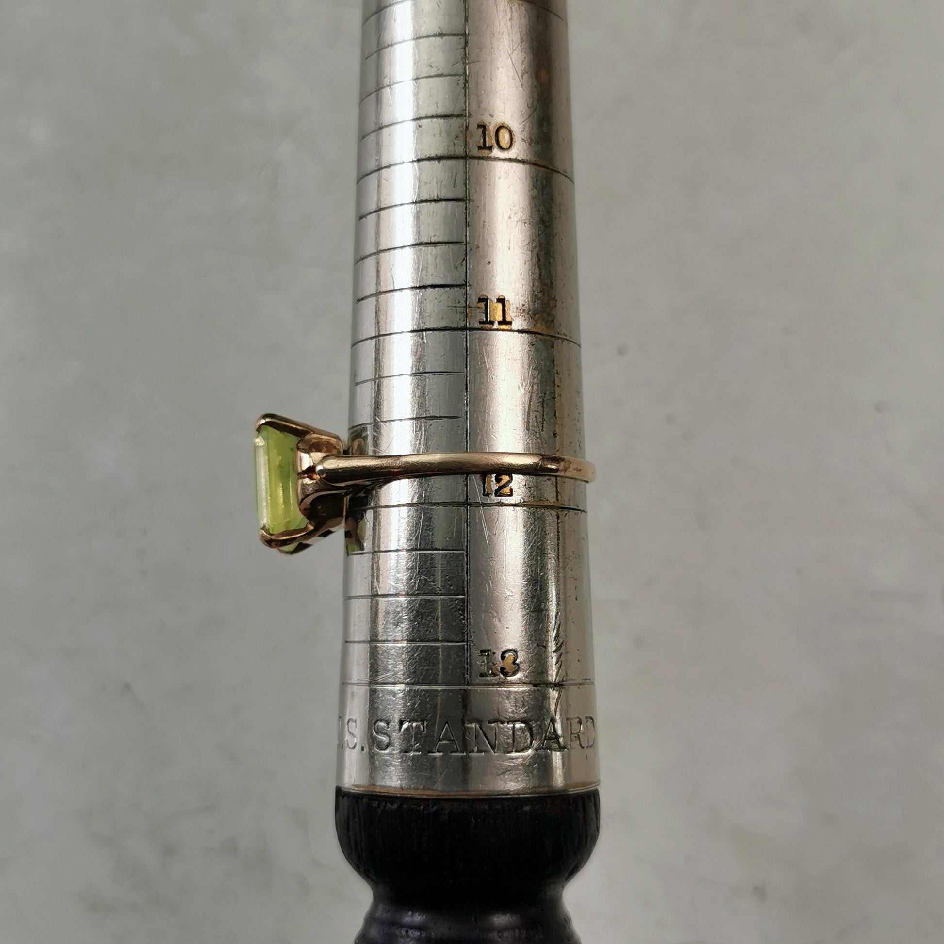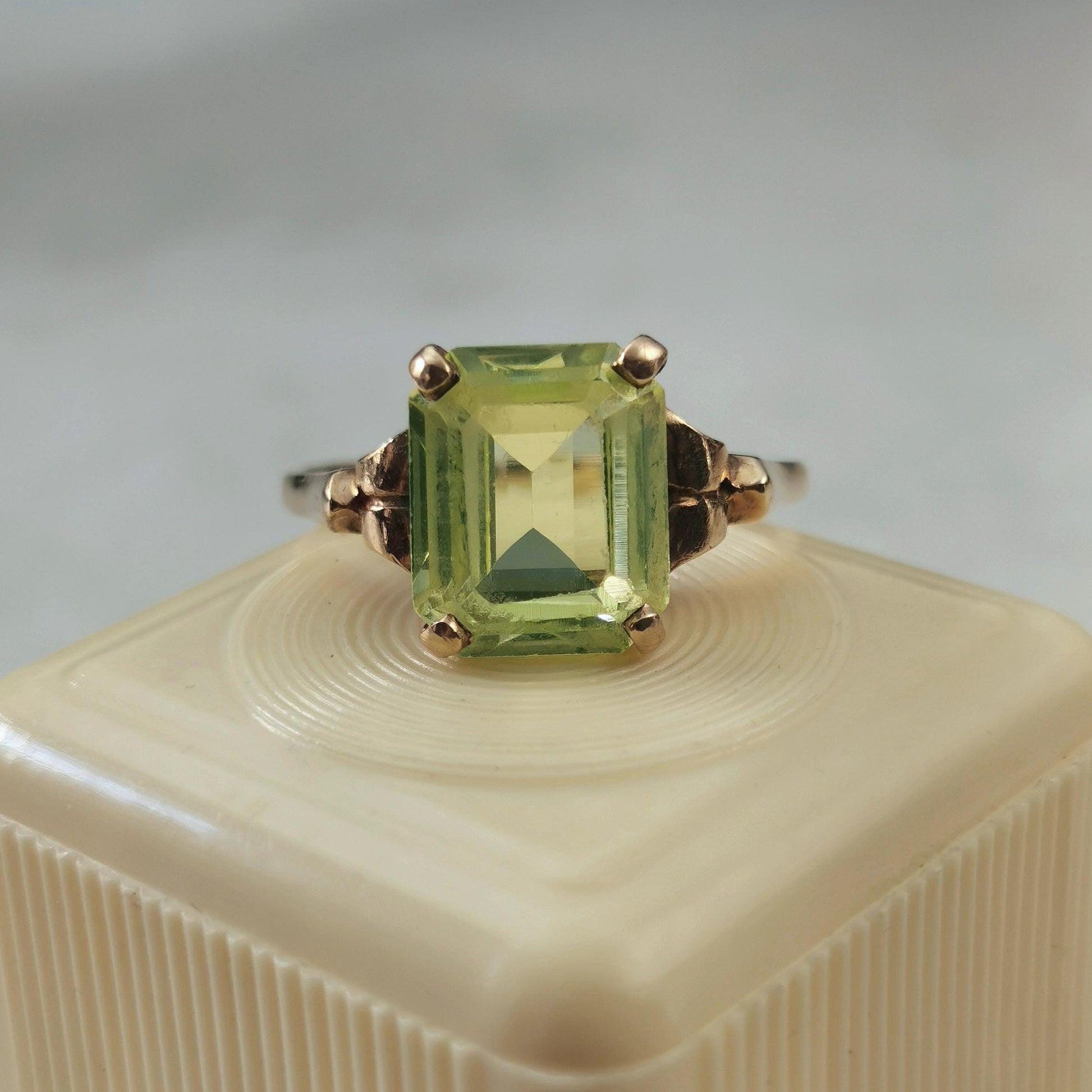- vintage ring features an emerald cut synthetic spinel in a neon yellow-green