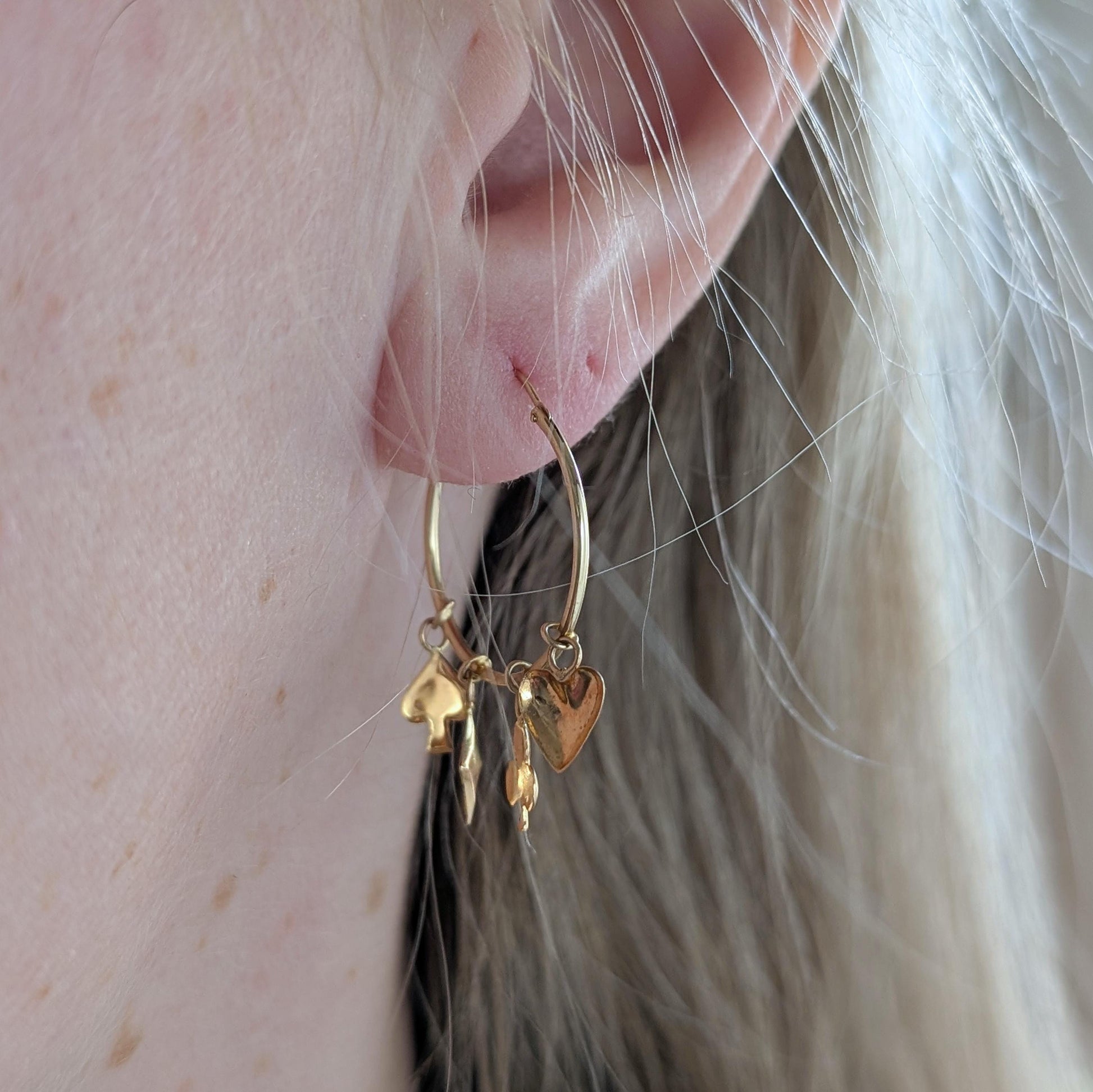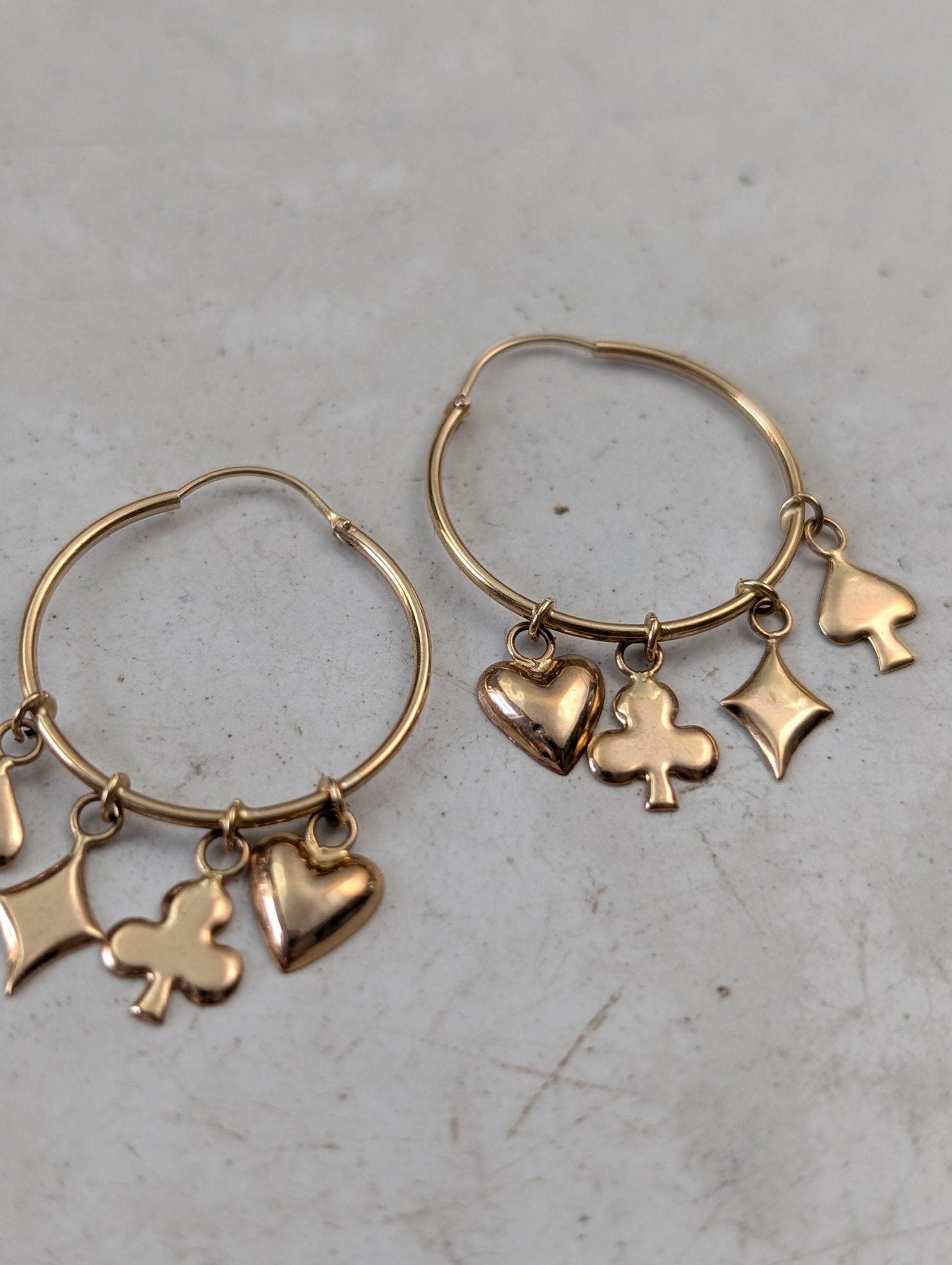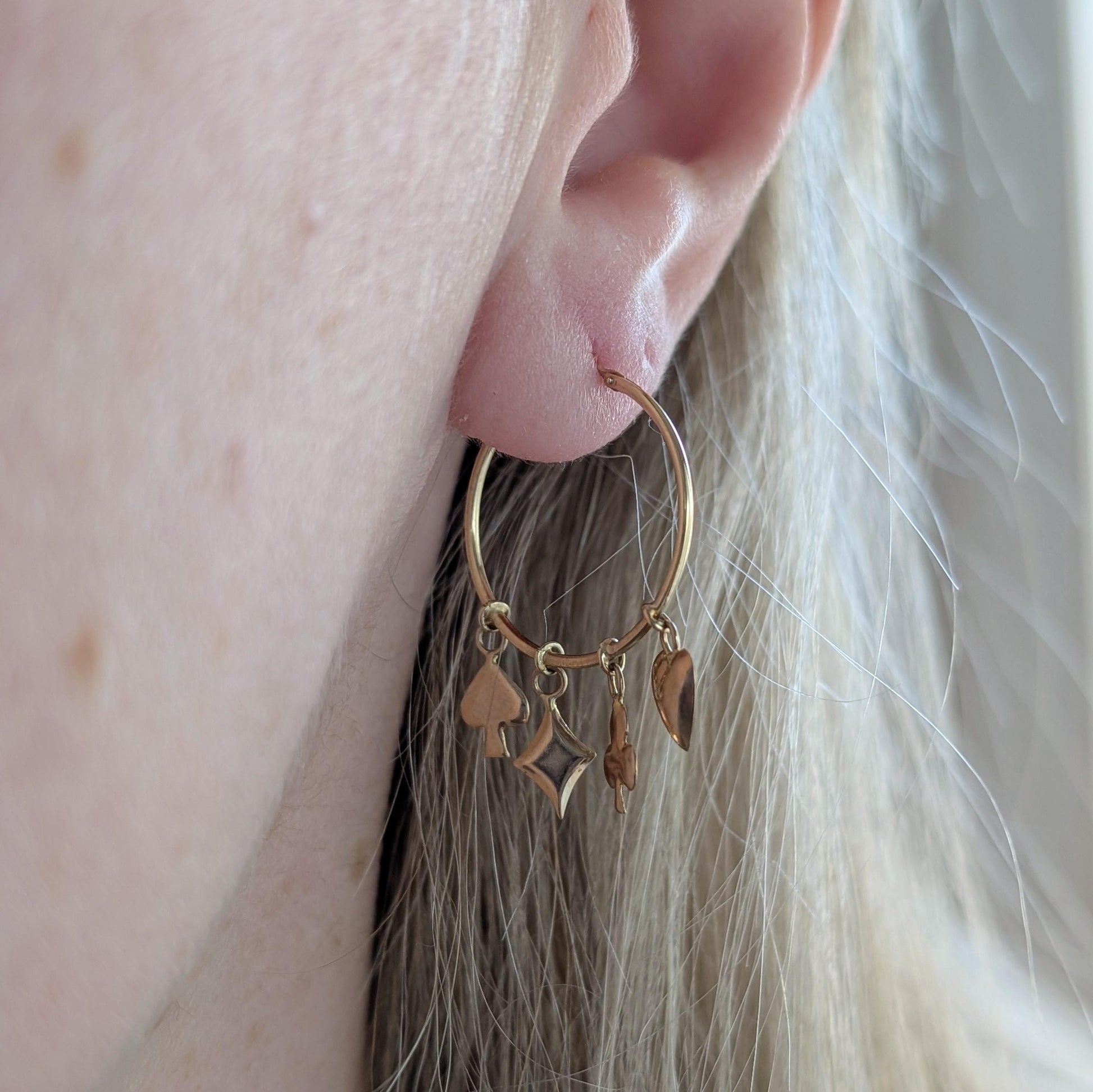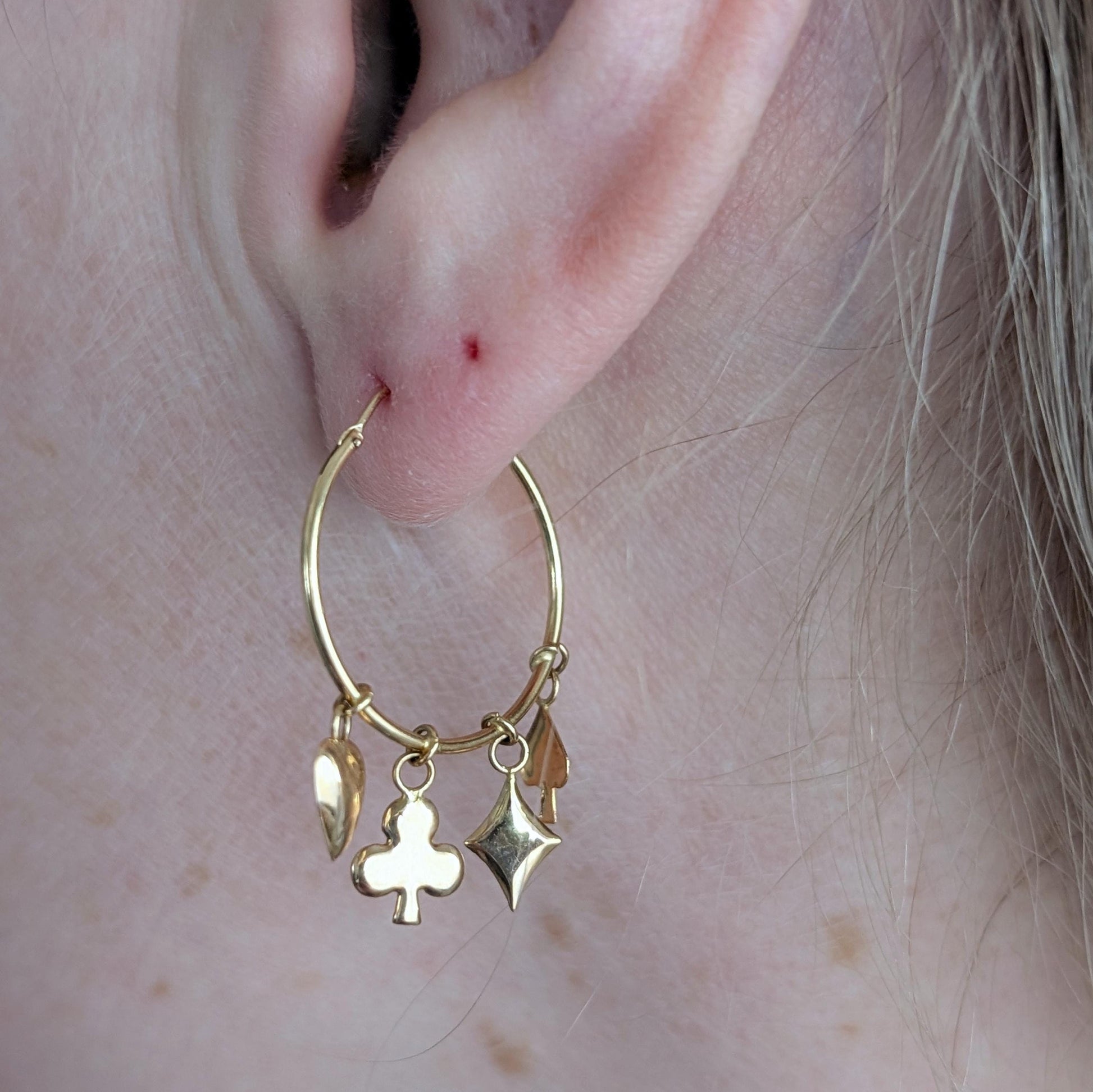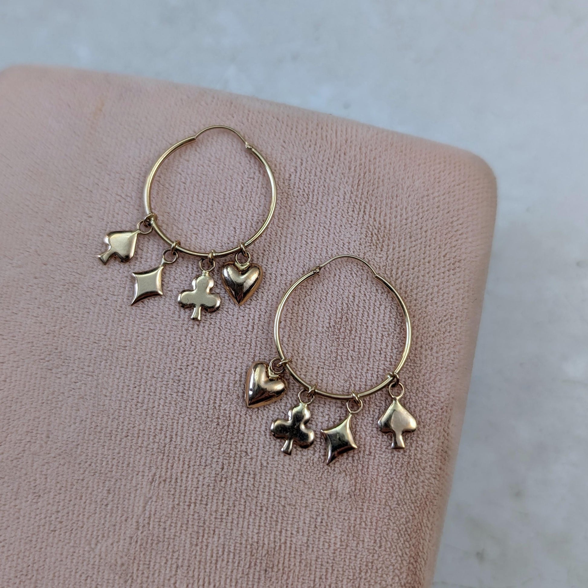 - these fun sleeper hoops have 4 jump rings soldered across base, with the four suits (Heart, Club, Diamond, Spade) dangling from them