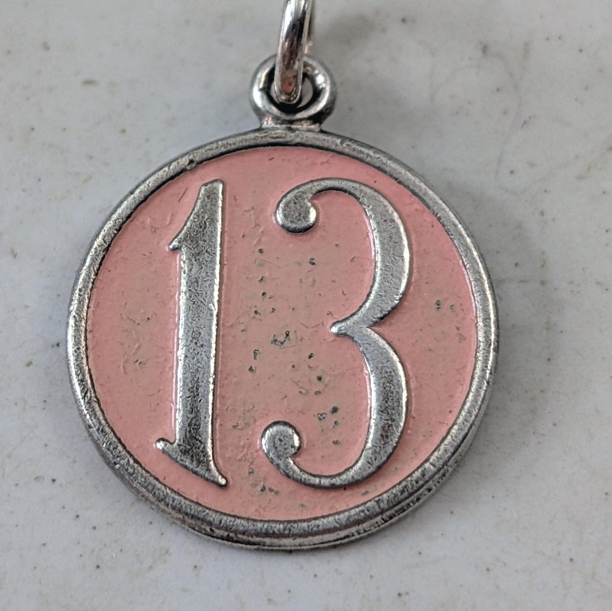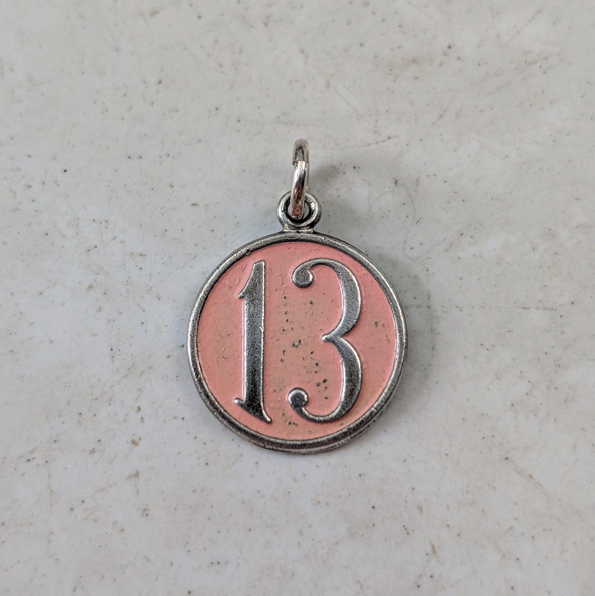 - this disc charm features the embossed number 13 with a pink enamel background