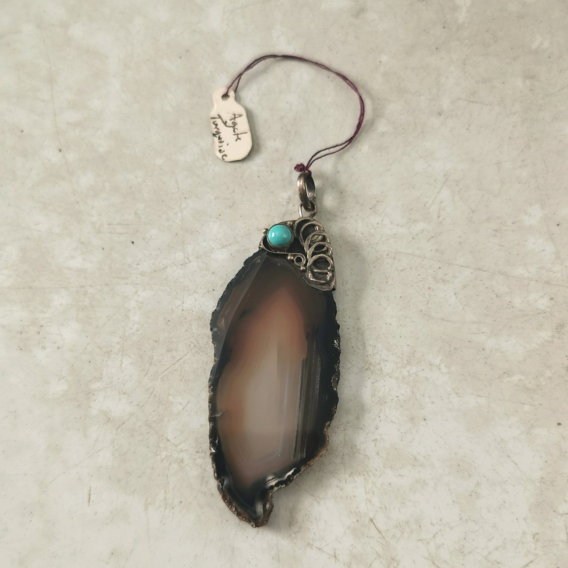 Vintage charm constructed of sterling silver, agate and turquoise. A silver capped brown banded agate slice has a bezel set round turquoise cabochon on it. Bail is soldered shut. This piece is vintage, never purchased inventory from a closed down store. Old tag attached reads "Agate Turquoise 36.00".