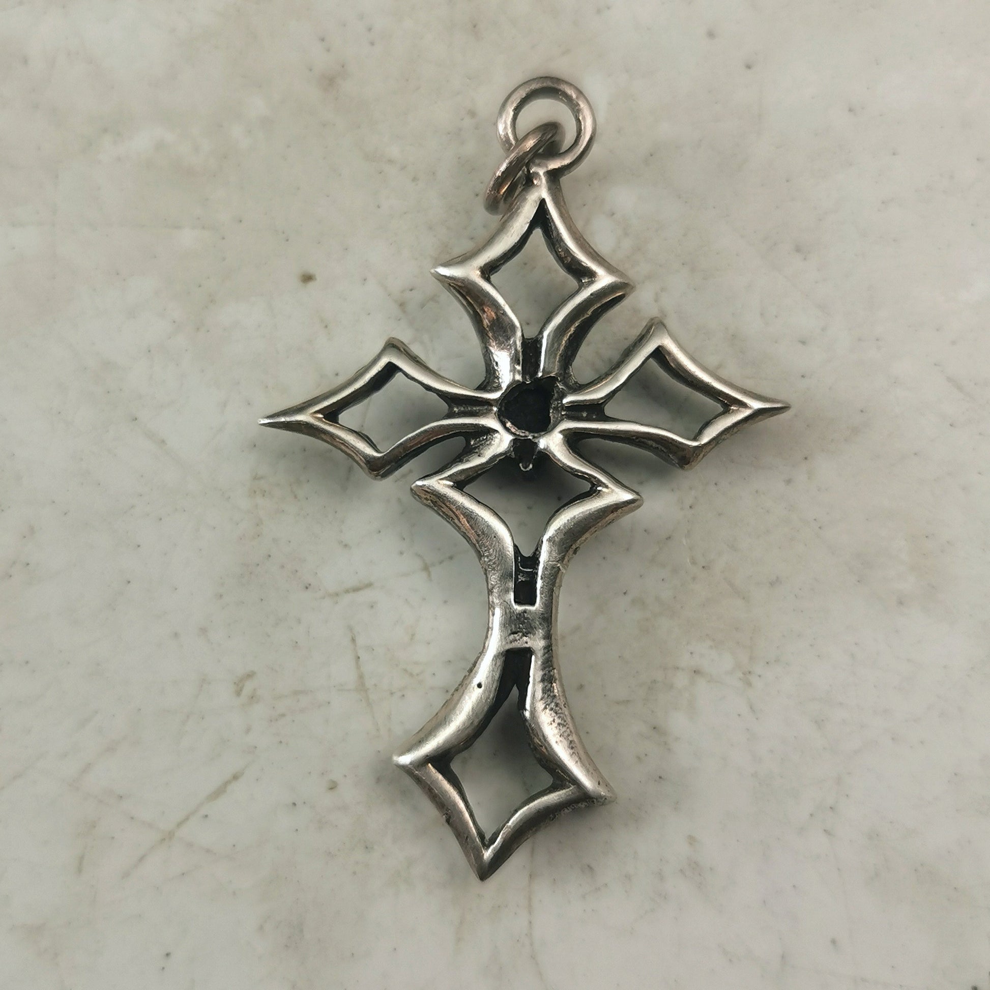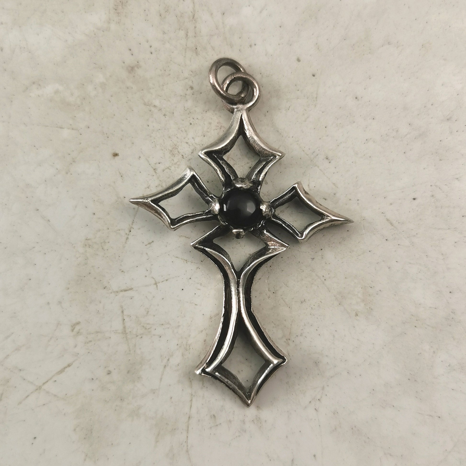 Vintage cross pendant constructed out of sterling silver and onyx. Gothic design. This piece is from an old store that closed in the 1980s, so item has never been used.