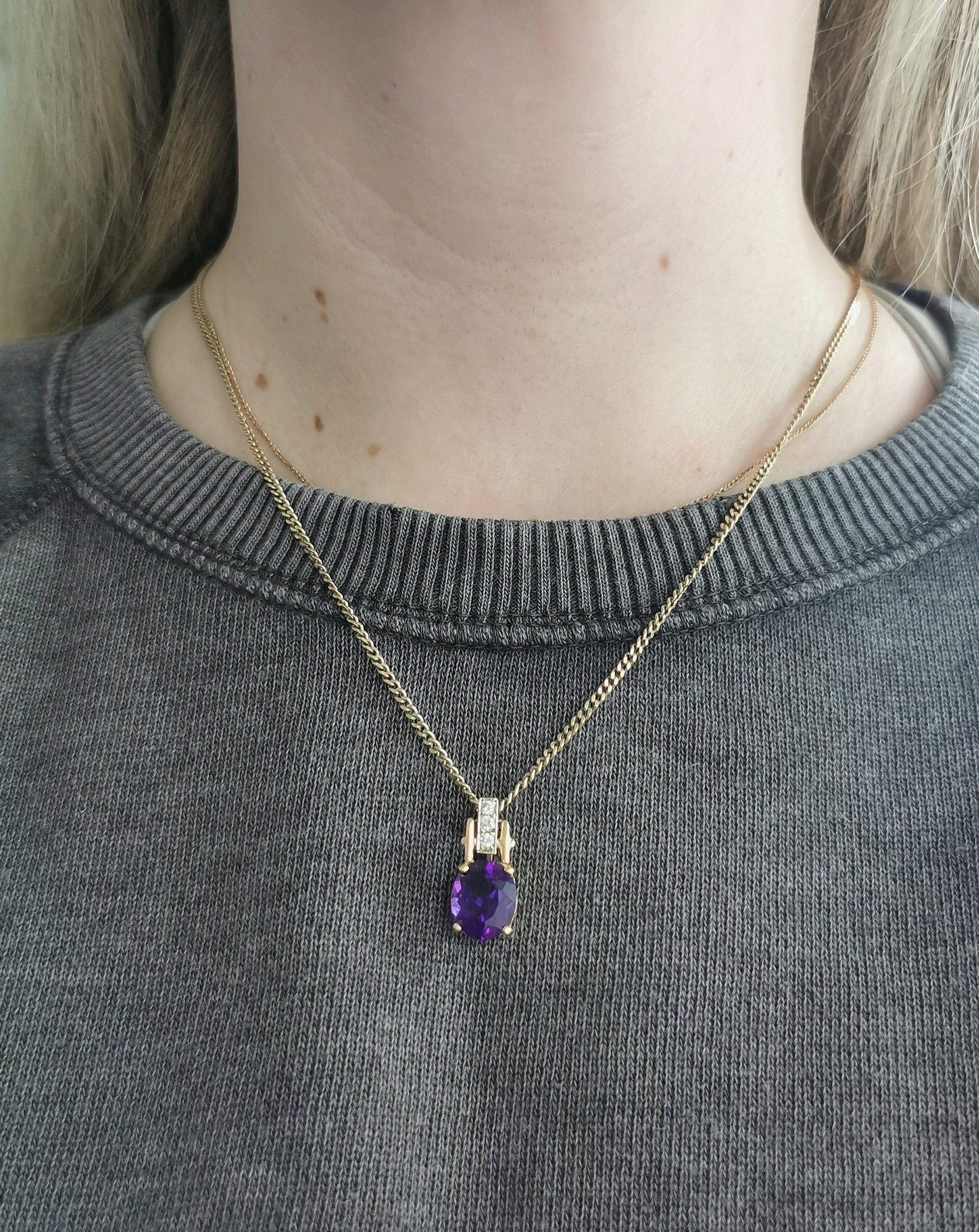 Vintage circa 1970's pendant constructed out of solid 14k yellow and white gold with genuine amethyst and diamonds. Pendant features a wide, slider style bail with three round brilliant cut diamonds bead set in a white gold panel. The diamonds measures approx. 2mm each for a combined 0.09ctw. Below, a claw set, oval mixed cut amethyst measures 11.4mm x 9.02mm (3.43ct). The amethyst is the most beautiful, vibrant shade of violet/purple with an excellent cut (very high quality stone).