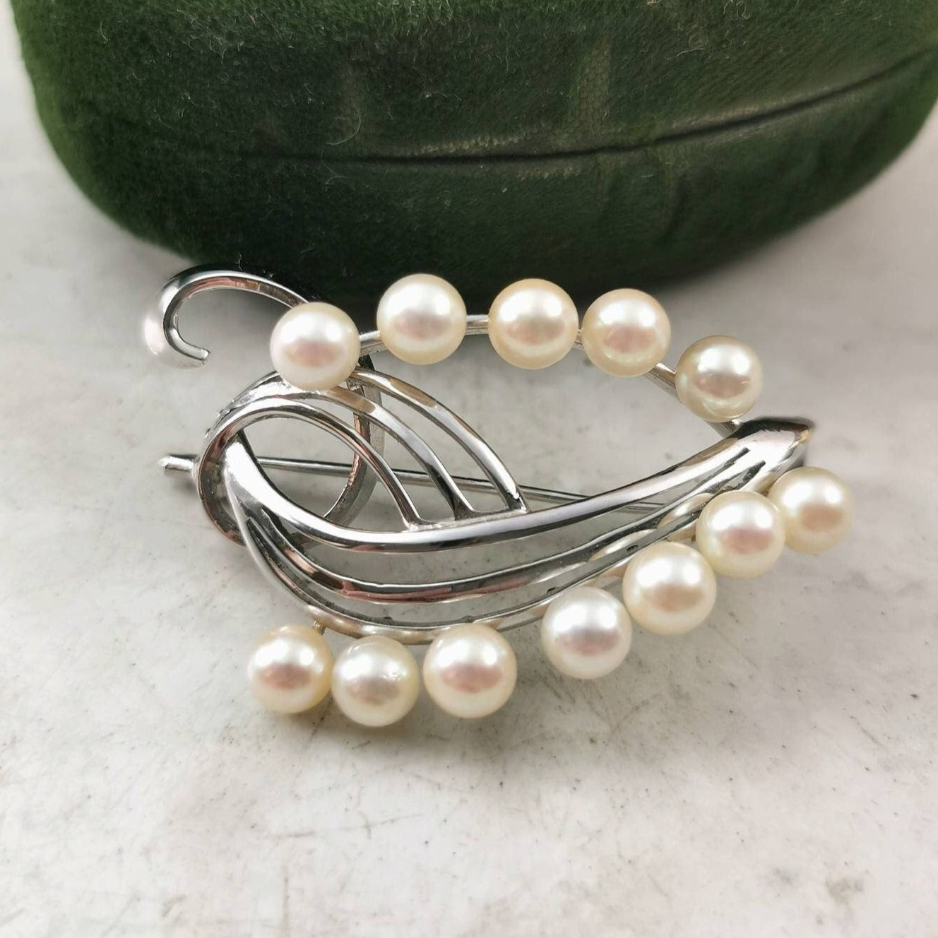 - abstract swirl brooch with 12 pearls glued onto settings around edge of brooch