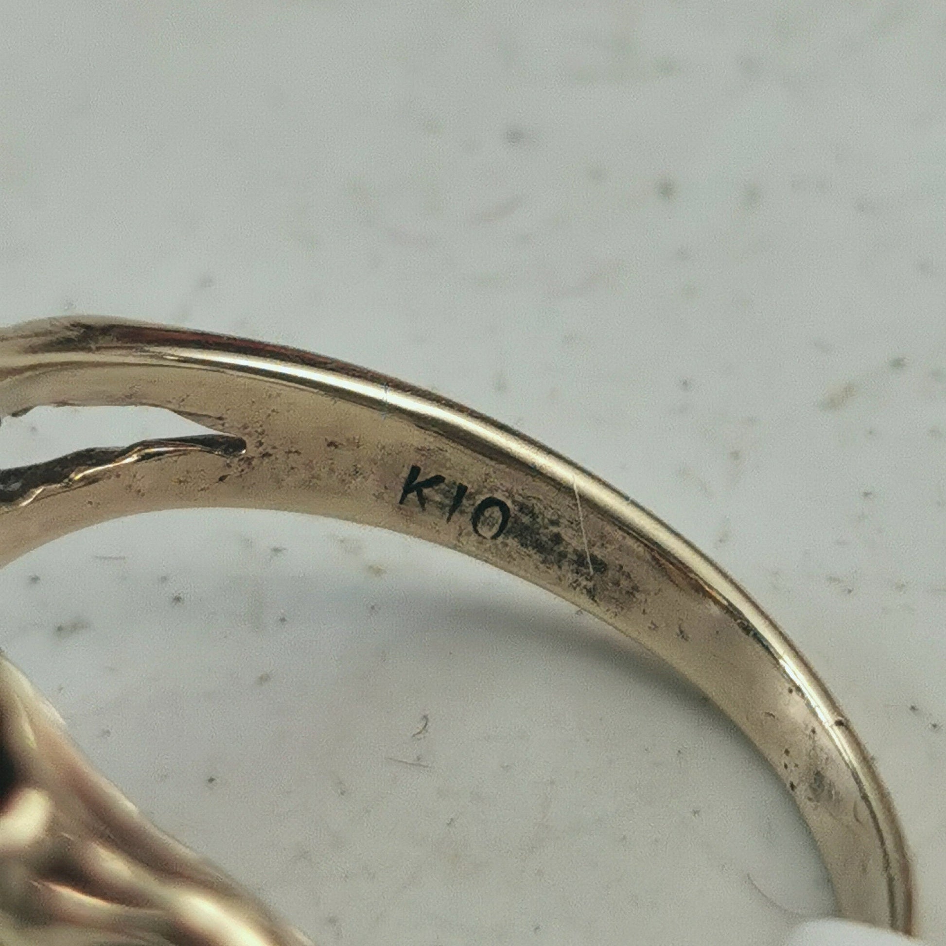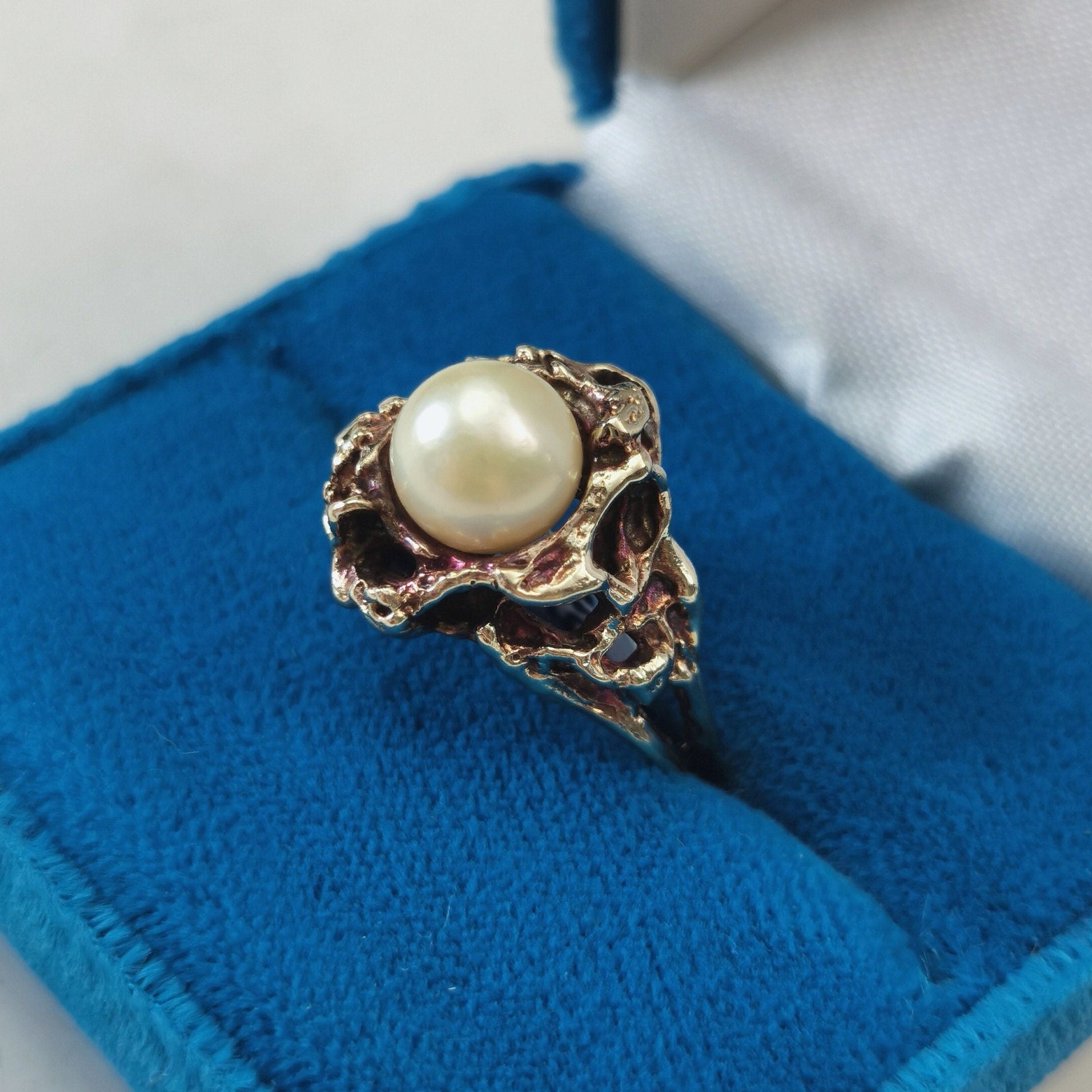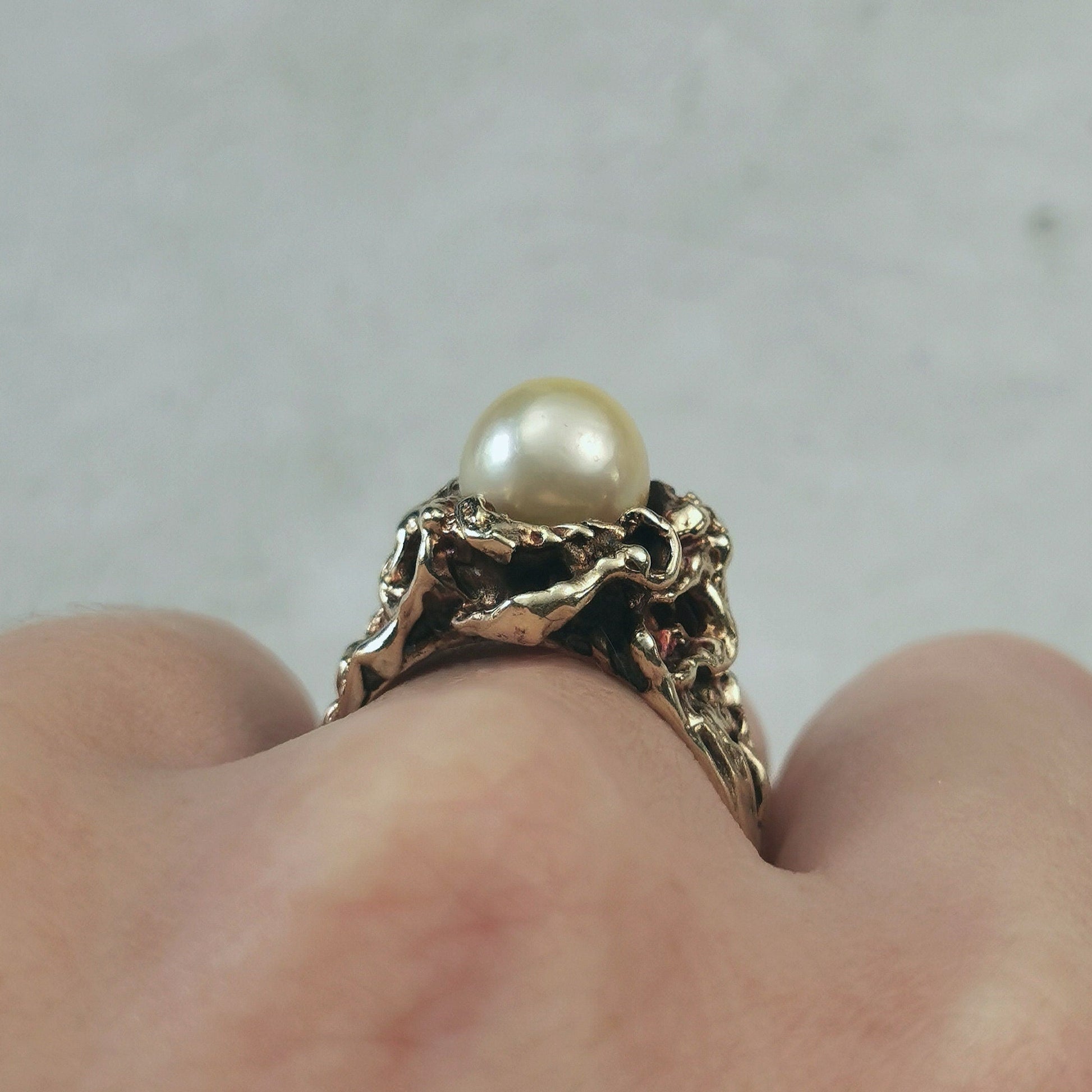 Vintage Mid-century Brutalist Cream Pearl Ring in 10k Yellow Gold