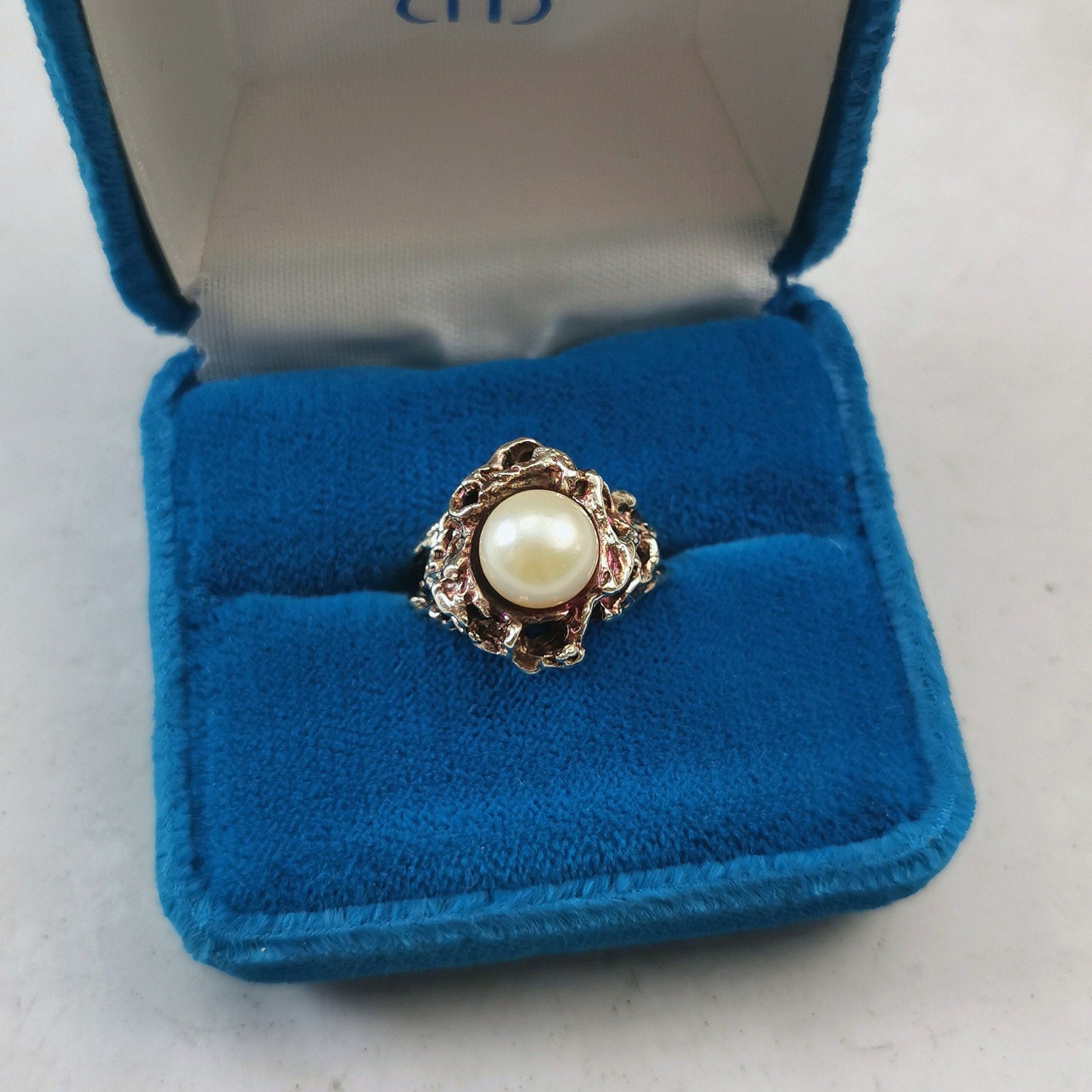 Vintage ring constructed of solid 10k yellow gold and cultured pearl. Ring features a 7.8mm cream coloured pearl siting in the centre of a heavy organic setting. The organic setting resembles a coral texture and has tarnish in its crevasses. The face of the ring is 1.6cm long and rises 1cm off finger. Heavy at 6.84 grams. Excellent vintage condition circa 1950s.