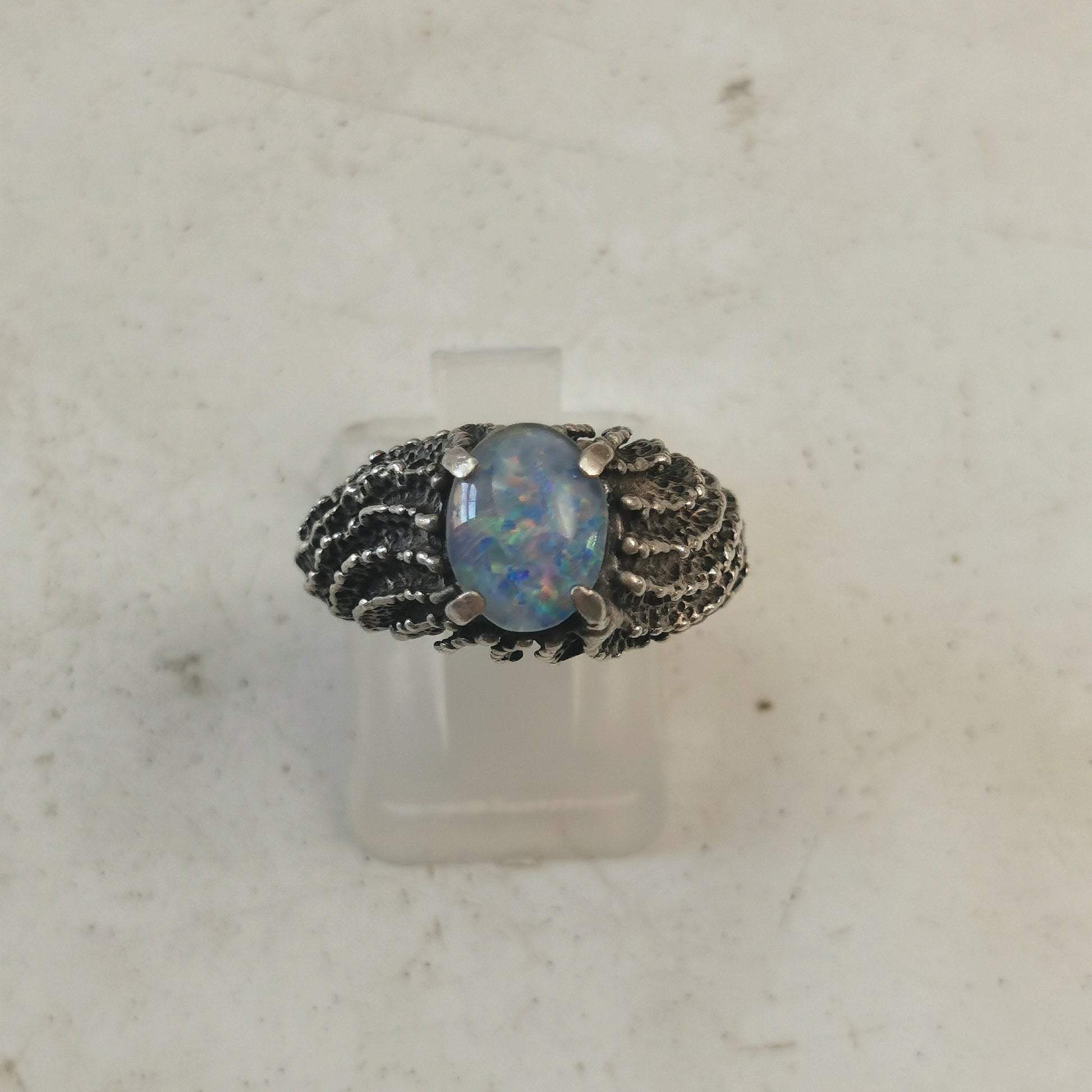 Vintage ring constructed out of solid sterling silver and an opal triplet. An opal triplets is a genuine slice of opal (usually black opal, like this ring) sandwiched between a black base (to enhance colour) and a clear top (for durability). The oval opal triplet measures 9.1mm long x 7mm wide is claw set at the centre of the ring. This chunky ring features a textured, organic ridged design that domes up off the finger. The face of the ring is 1cm long and rises 8mm off the finger. Excellent vintage condition circa 1950s.