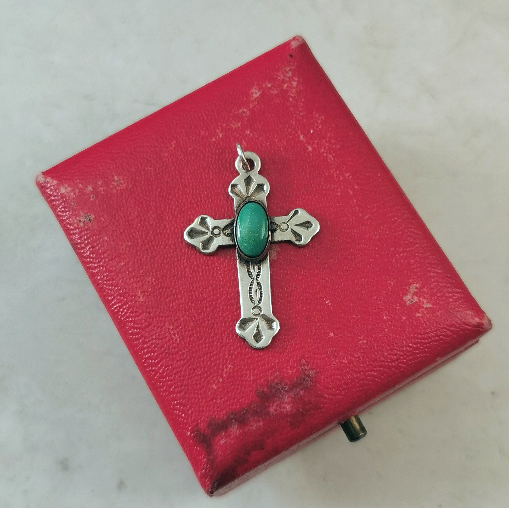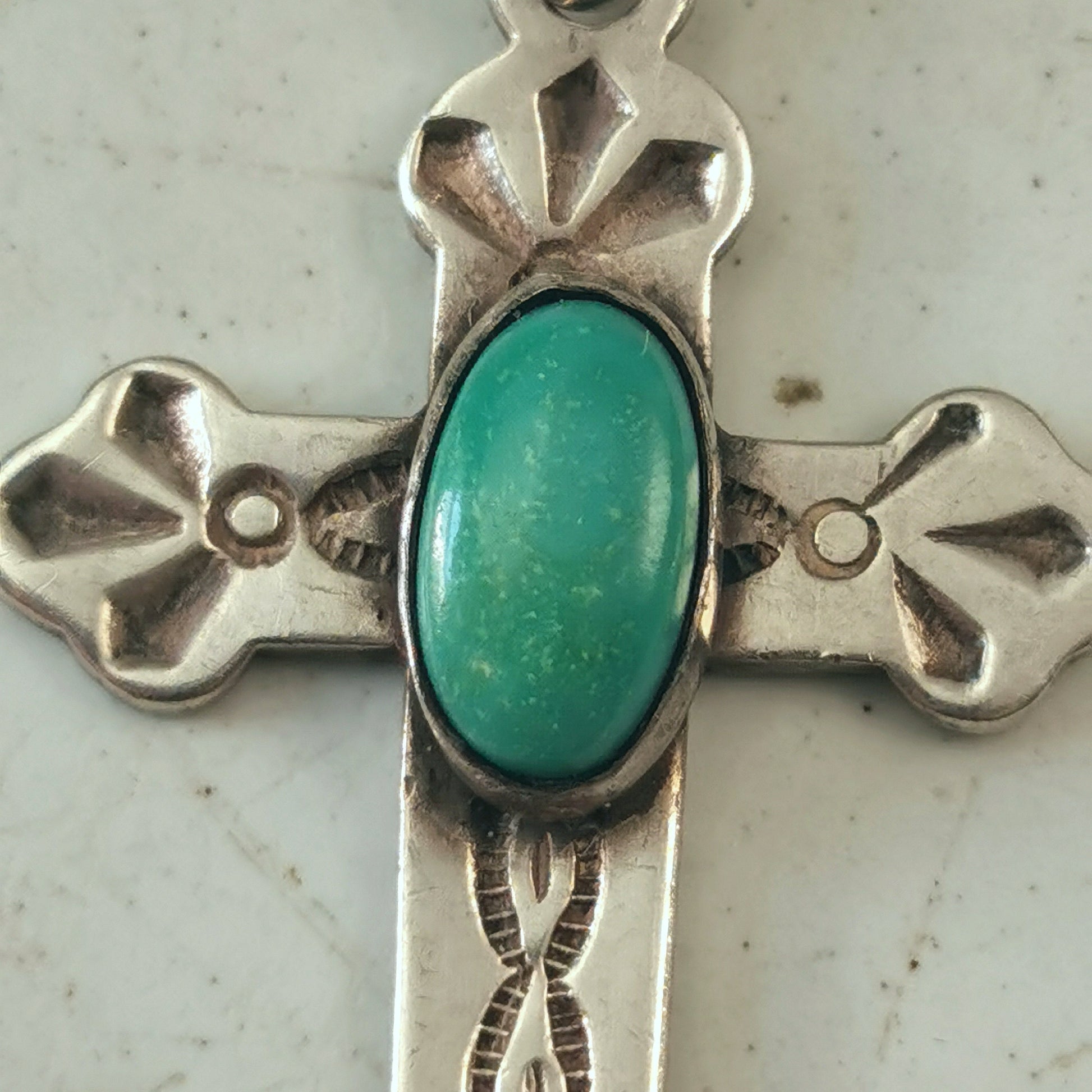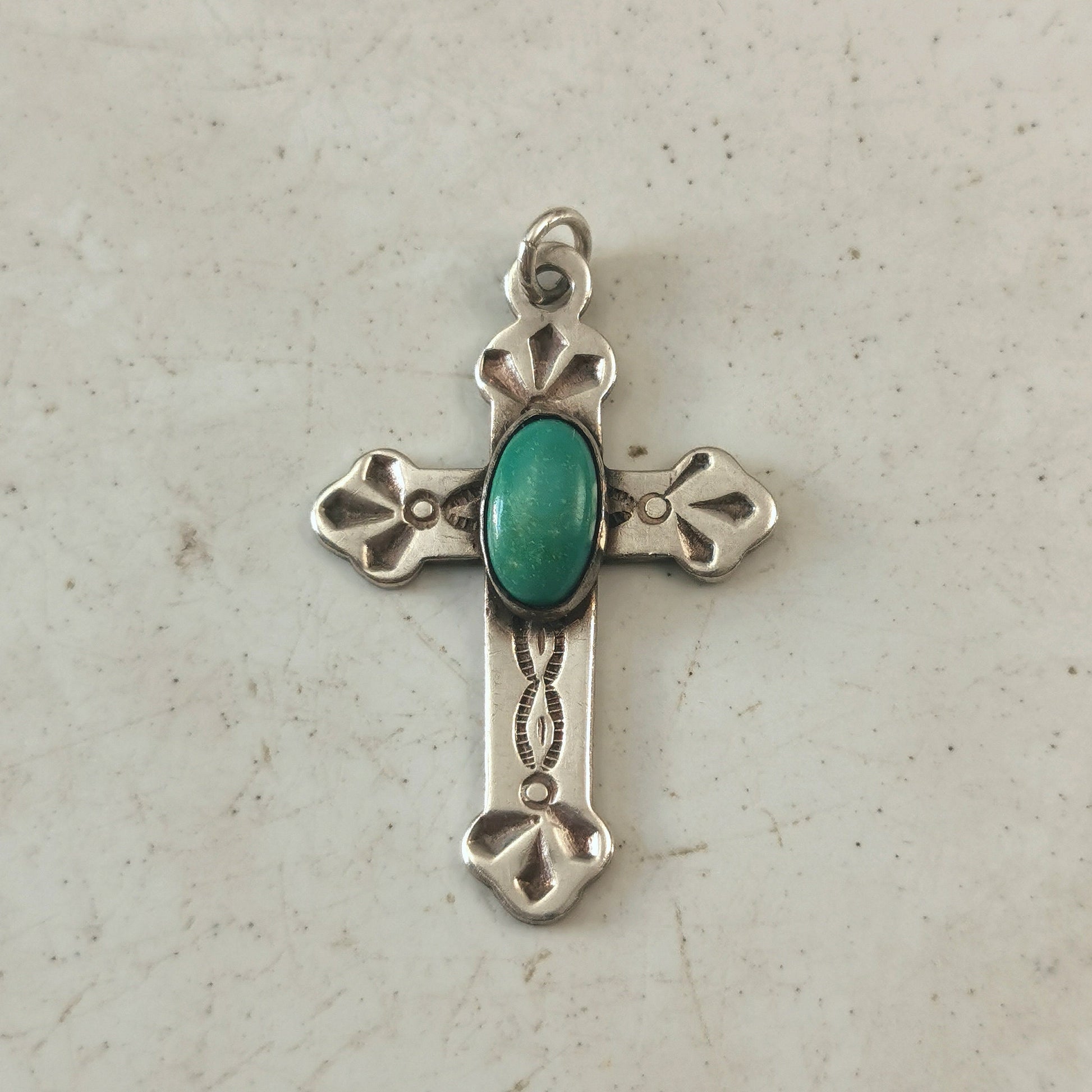 - face of cross features an oval turquoise cabochon with a lovely stamped pattern on cross