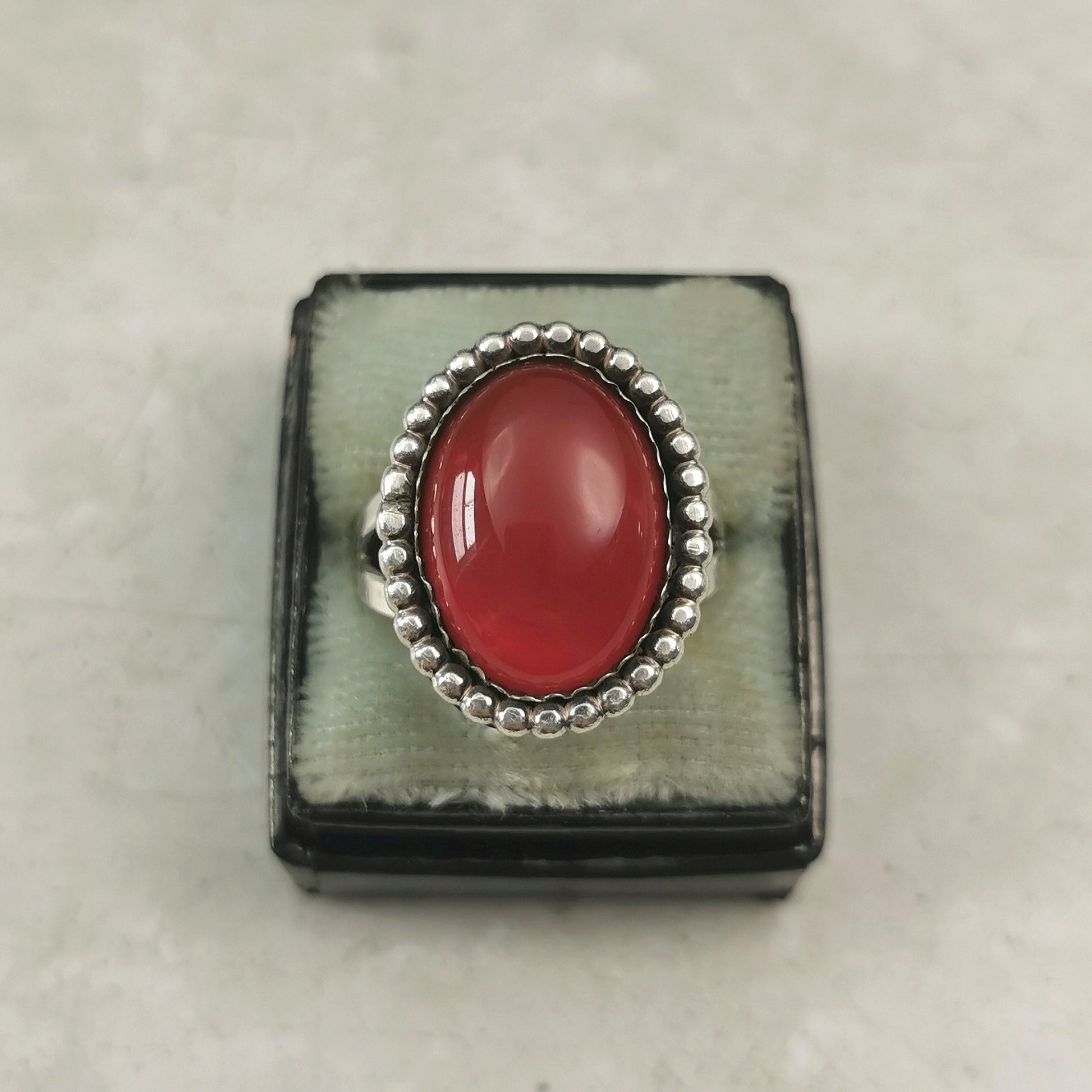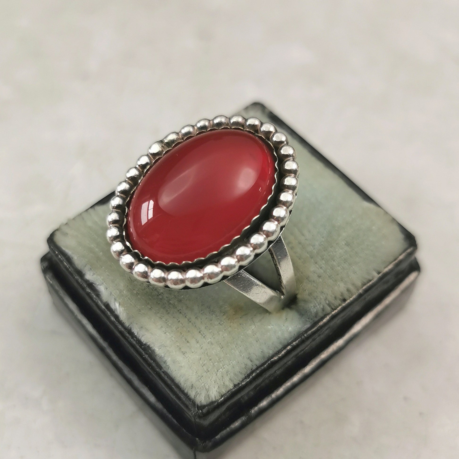 Vintage 1950-60s South Western ring constructed of sterling silver and carnelian. An 18.1mm x 13.3mm oval carnelian cabochon is bezel set with a halo of silver beads