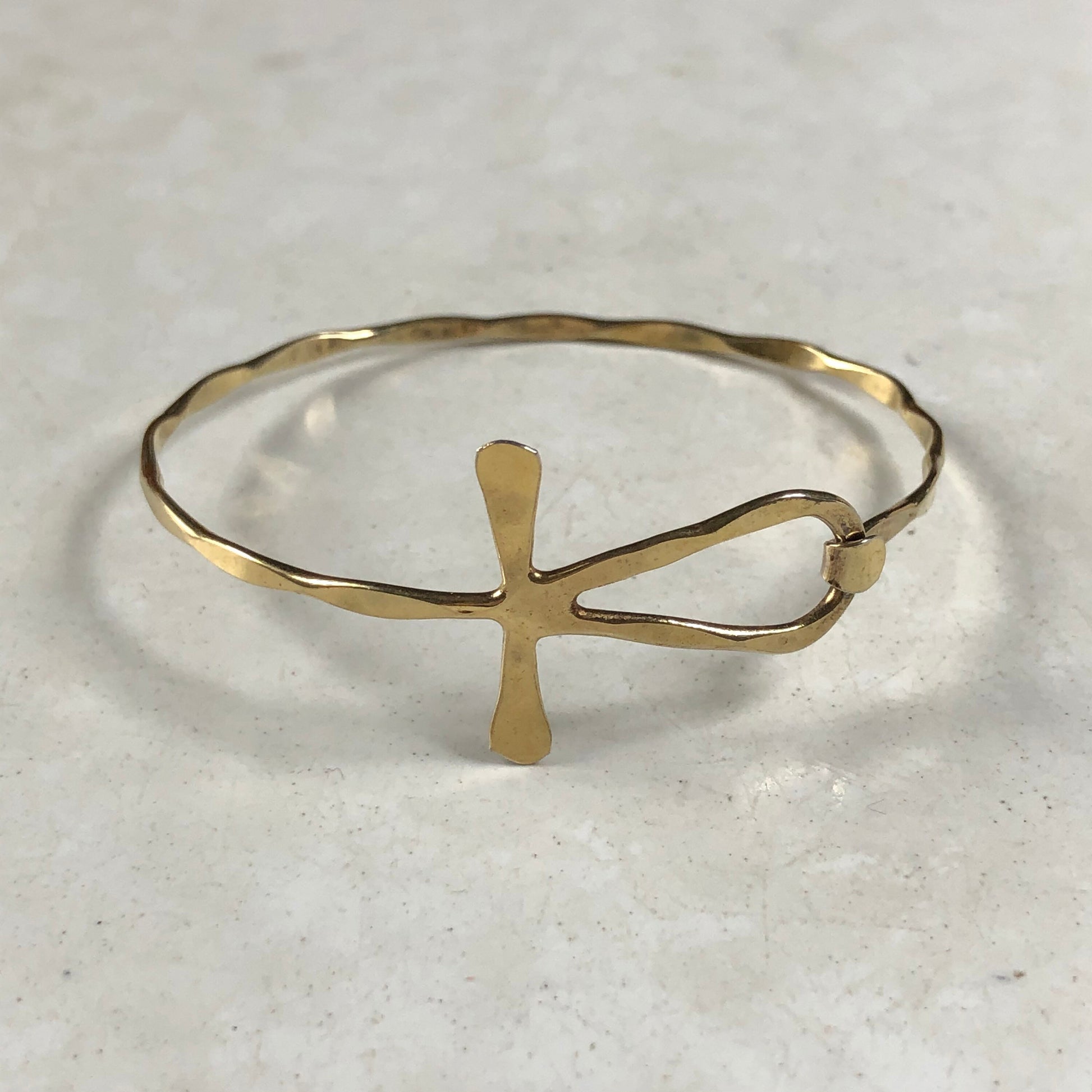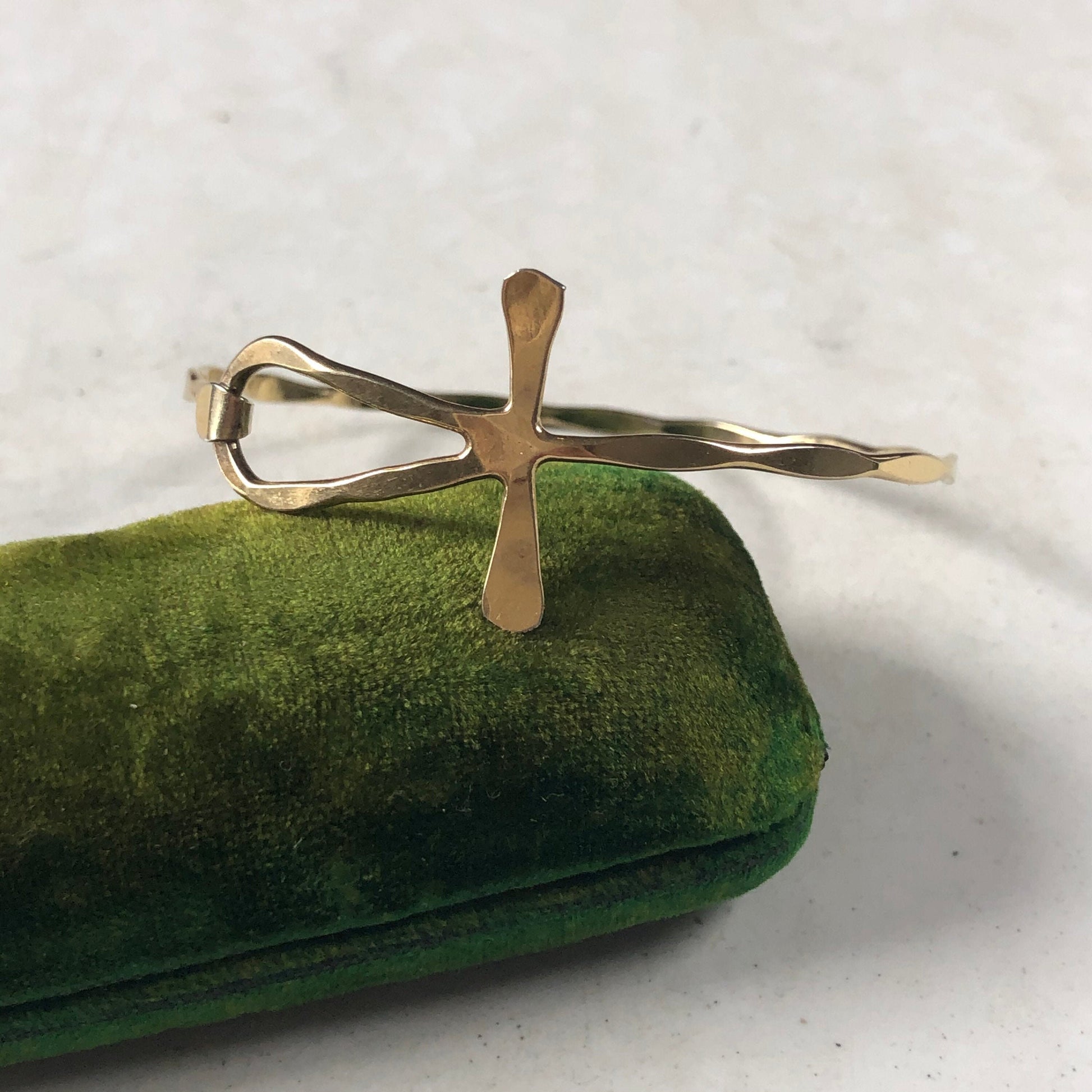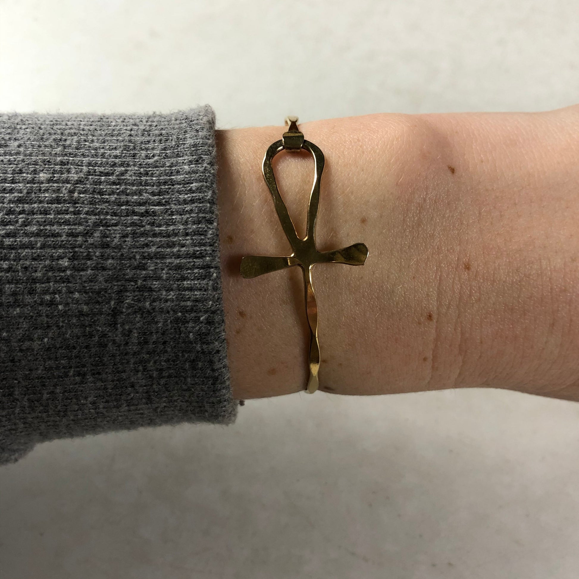 Vintage circa 1970's bangle bracelet constructed out of solid sterling silver with gold vermeil. Stylized Egyptian ankh with a hammered finished is stretched out lengthways across wrist. A hook catches on the top loop of the ankh for a secure closure. Bangle measures 7" from top of Ankh to base of hook, but fits a 6.75 or smaller wrist.