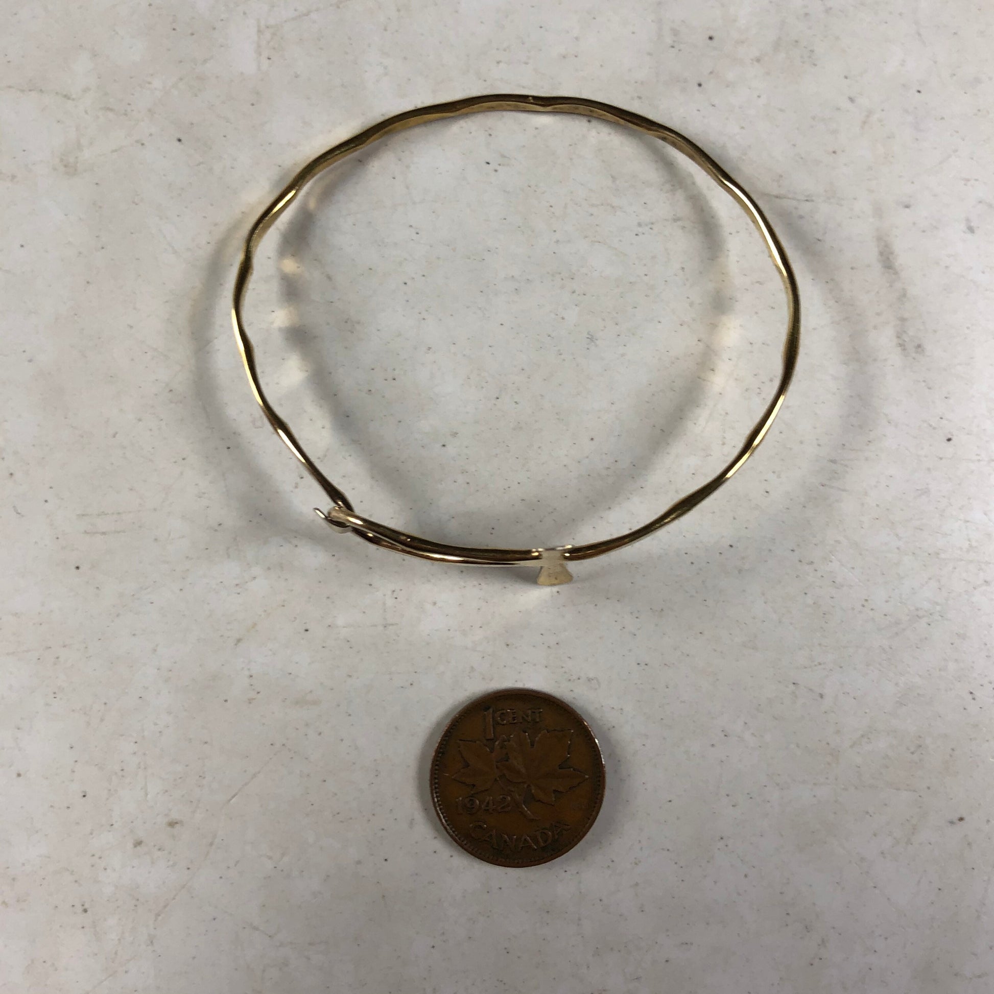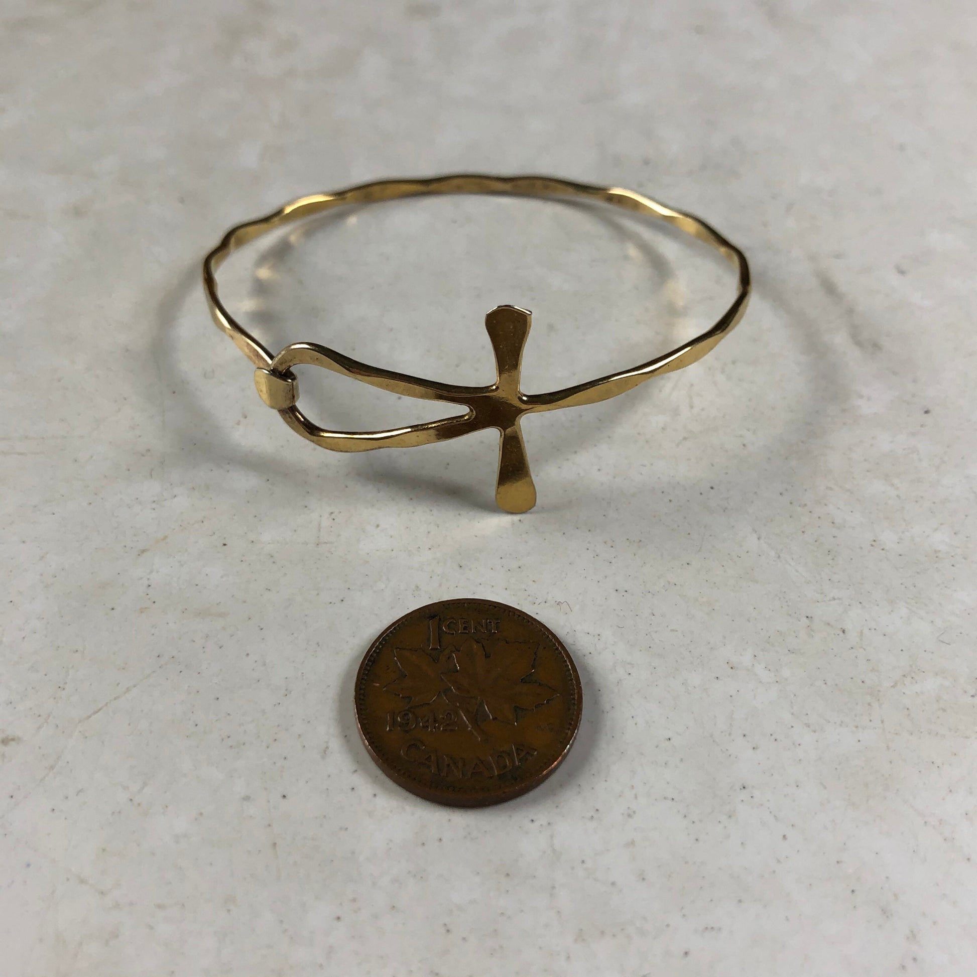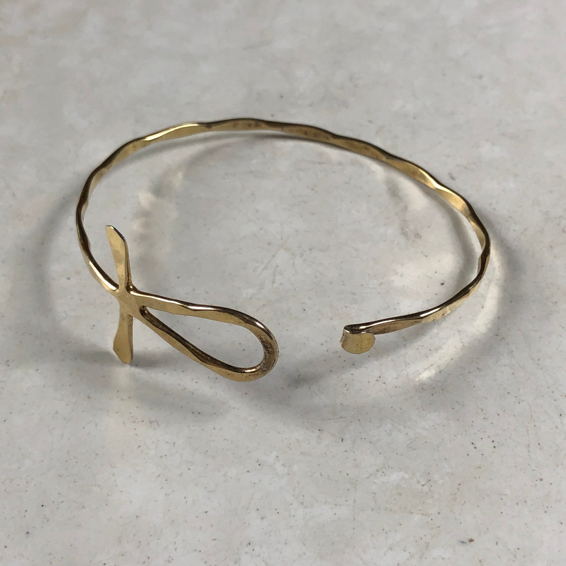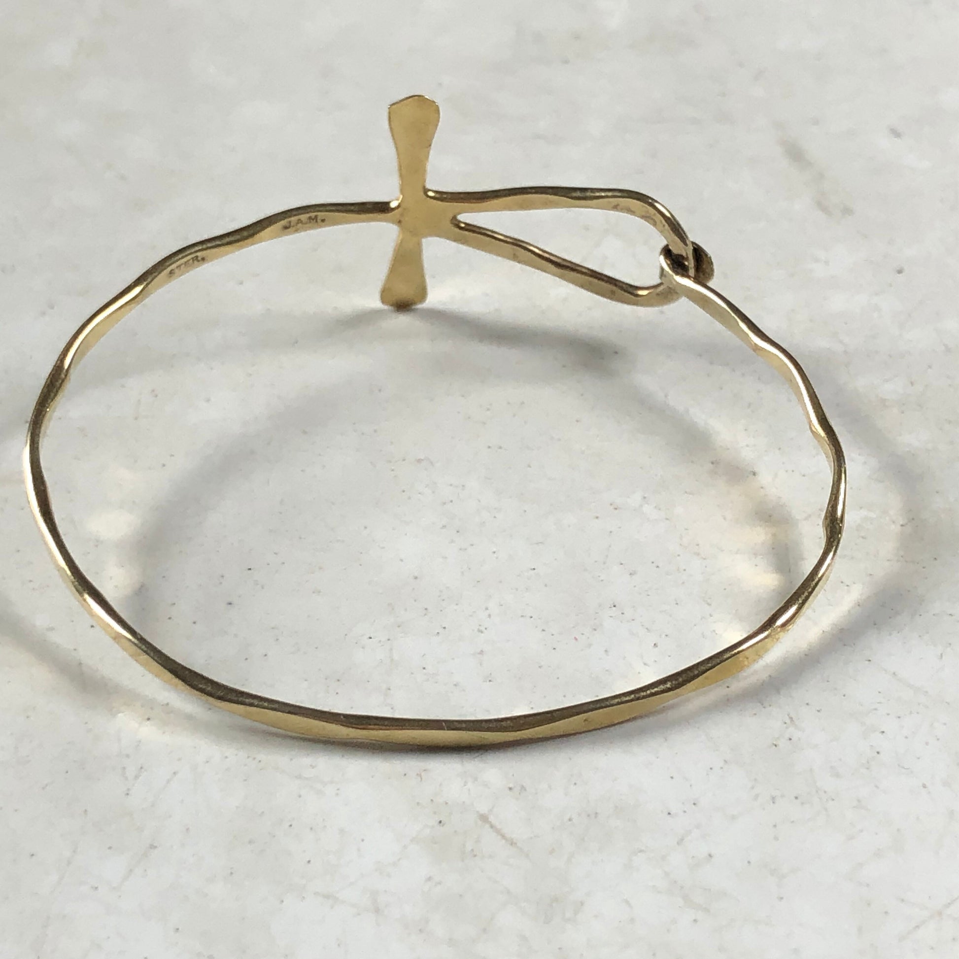 Vintage circa 1970's bangle bracelet constructed out of solid sterling silver with gold vermeil. Stylized Egyptian ankh with a hammered finished is stretched out lengthways across wrist. A hook catches on the top loop of the ankh for a secure closure. Bangle measures 7" from top of Ankh to base of hook, but fits a 6.75 or smaller wrist.