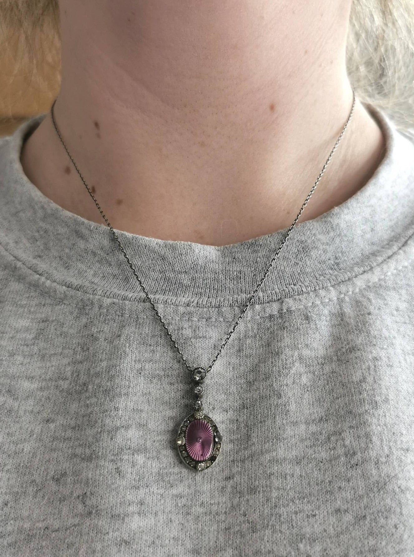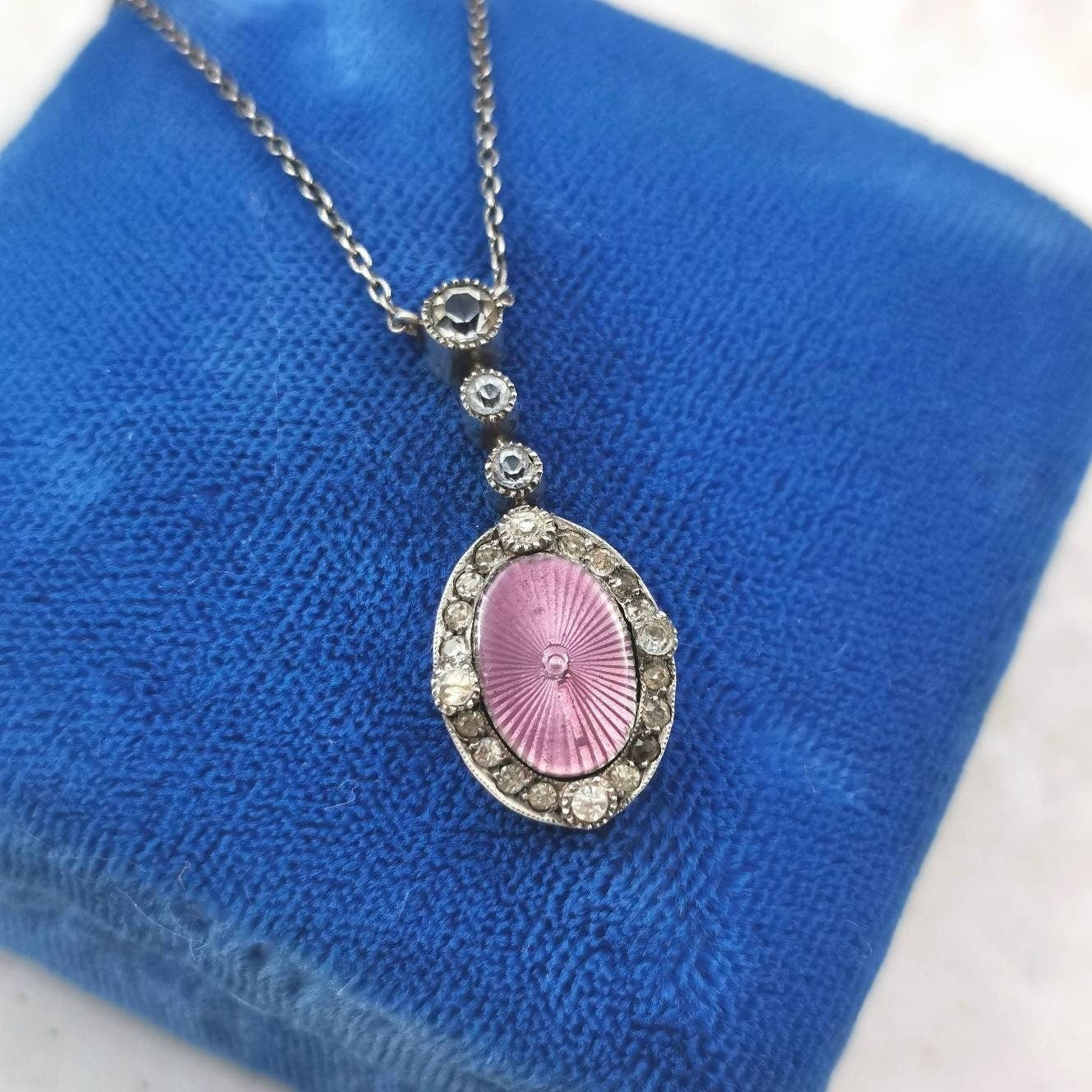 Vintage Sterling Silver Guilloché Enamel & Rhinestone Lavalier