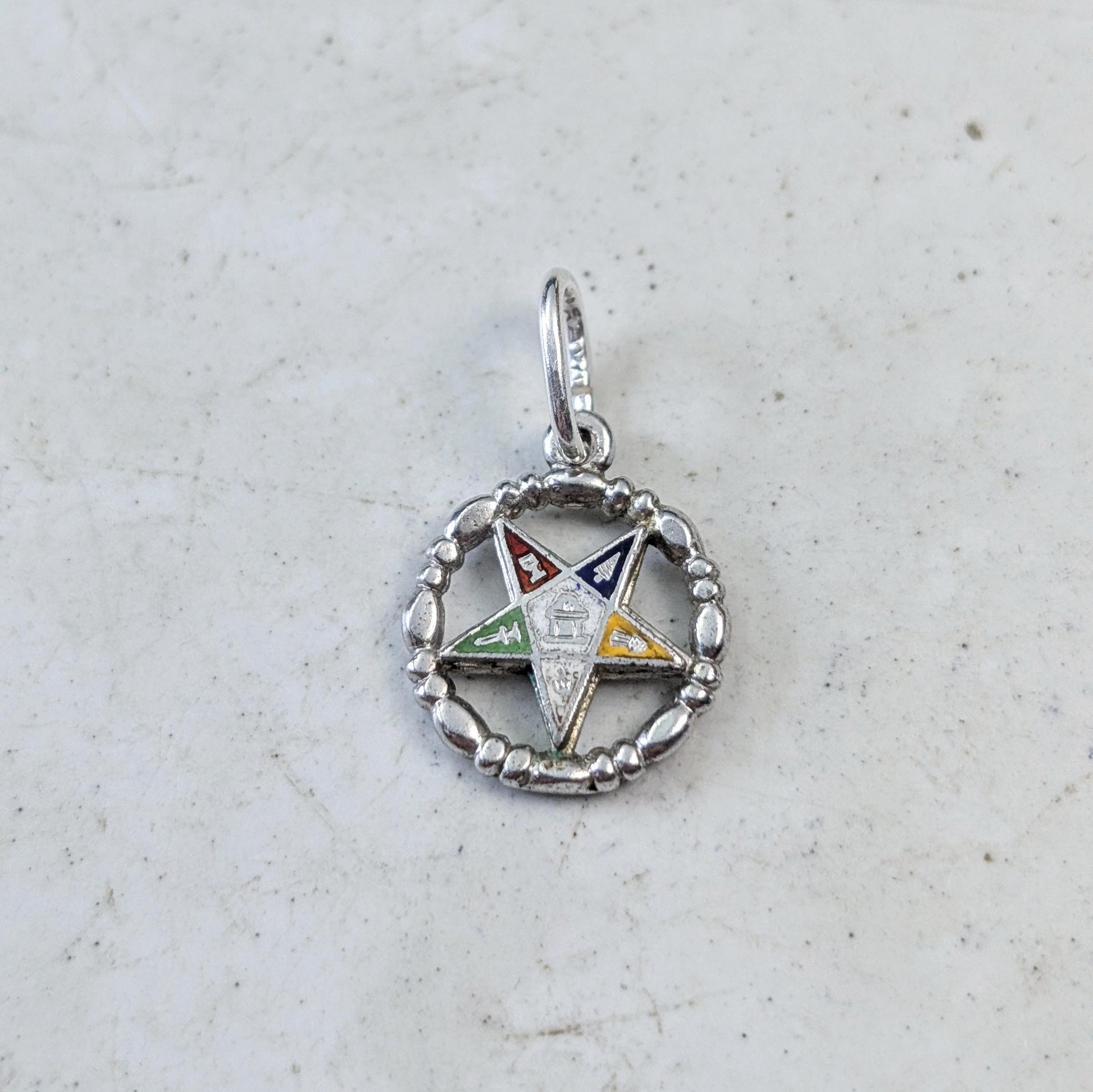 - charm features the eastern star emblem set inside of a beaded border